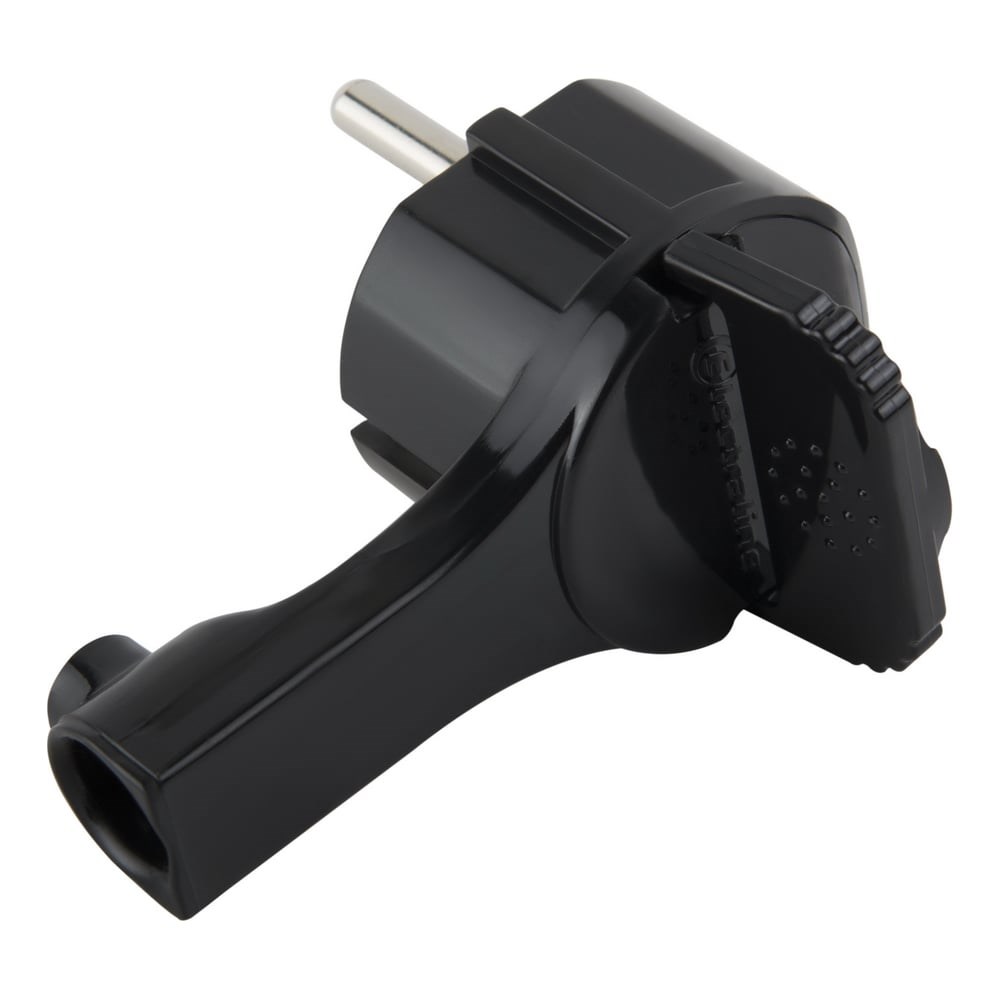 Это угловая плоская вилка с заземлением для подключения мощных электрических приборов с максимальным током 16 ампер. Благодаря своей угловой конструкции, вилка идеально подходит для использования в ограниченных пространствах, таких как за мебелью, где стандартные вилки могут быть неудобными. Она также оснащена заземлением для повышения безопасности использования.