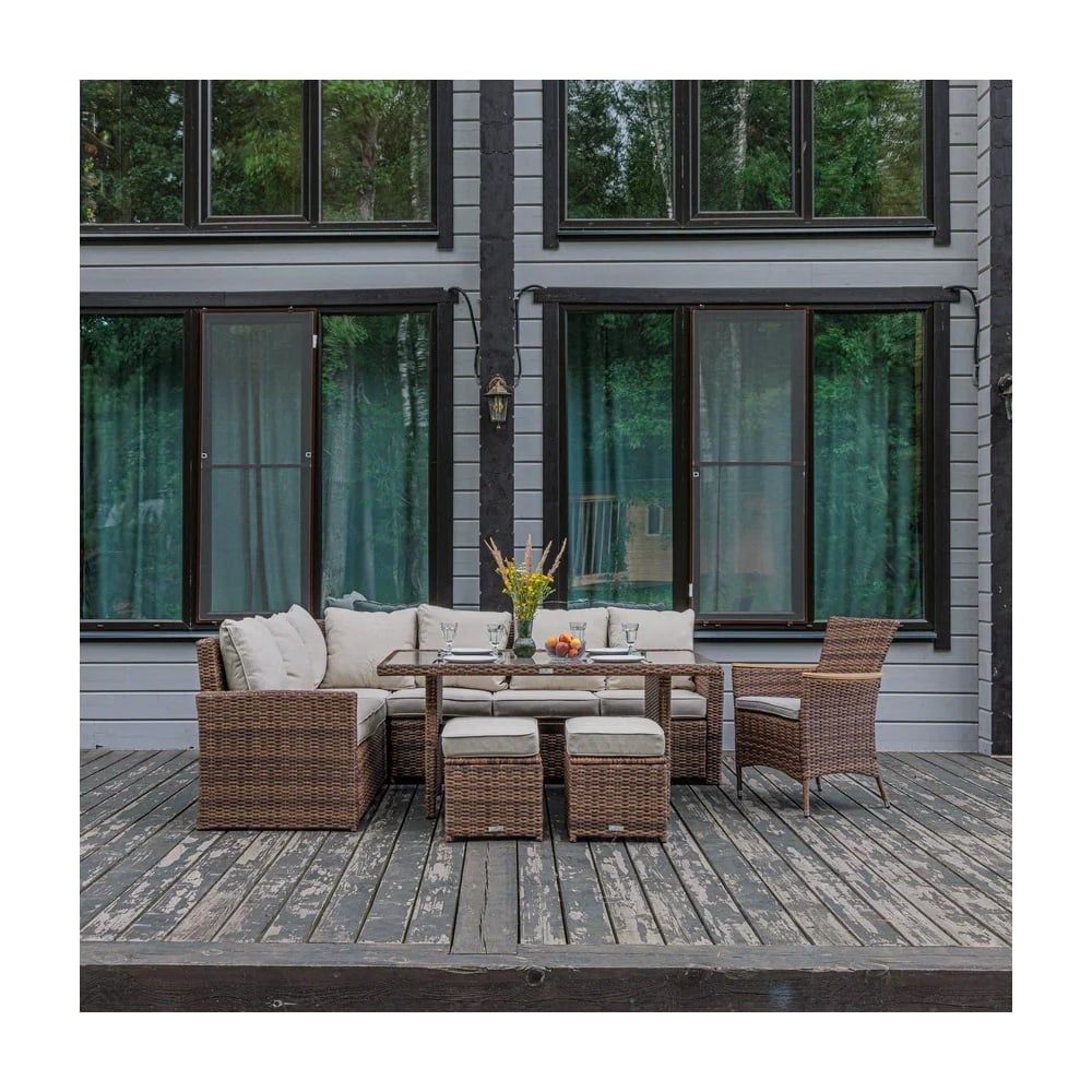 Комплектация и габариты:Диван прямой - 171x71x81 смДиван угловой- 183x71x81 смКресло - 60х59х87 смОбеденный стол - 150x90x70 смПуф (2 шт) - 40x40x33 смПодушки под спину (7 шт) - 53х48х22 смПодушки для сиденья (6 шт) - 60х10х56 смПодушки для сиденья на кресло (1 шт) 47х7х44 смПодушка для сиденья на пуф (2 шт) - 40х10х40 смМатериалы:Материал комплекта - искусственный ротанг (ручного плетения)Материал каркаса – сталь, окрашенная порошковым методомМатериал столешницы - закаленное стеклоМатериал подлокотников кресла - поливуд (искуссвенное дерево)Материал чехла на подушки - олефин (водоотталкивающая ткань)Материал наполнителя подушек под спину - синтетический пухМатериал наполнителя подушек для сидения - поролонЦвет комплекта - коричневыйЦвет подушек - бежевыйДополнительная информация:Количество посадочных мест – 8-10 человекМаксимальная нагрузка на посадочное место - 150 кгЧехлы съемные - даТемпературный режим - от -50C до +50CСочетается с комплектами бренда ROYAL FAMILY - ZOYA, KARL, GRAND VICKY, FIONA, VIOLETTA в коричневом цветеНакладки на ножки - да (пластиковые)Категория ротанга - первичнаяДержатели и крепления подушек зависят от поставки и не являются неотъемлемой частью комплекта