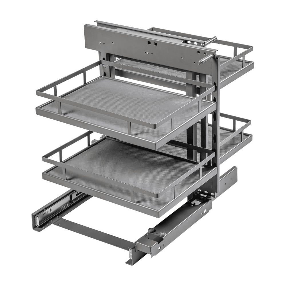 Волшебный уголок MovixPro универсальный в модуль 800 мм, с двумя выдвижными корзинами с доводчиком, антрацит, (плоский прут) - выдвижная система хранения, устанавливаемая в нижний модуль кухонного гарнитура.Ширина модуля, для которой предназначен волшебный уголок MovixPro - от 800 мм. Ширина фасада - 450 мм.Нагрузка: по 5 кг на каждую из полок первой корзины, по 7 кг на каждую из полок второй корзины.