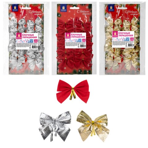 В комплекте 12 бантиков. Поставляются в 3 цветах: золотистый, серебристый, красный. В промежуточной упаковке представлено 3 цвета. Размер украшений – 5x5 см. Материал – полиэстер. Упакованы в пакет с европодвесом.