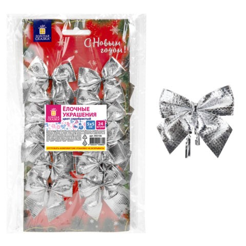В наборе 24 бантика серебристого цвета. Размер украшений - 5x5 см. Материал - полиэстер. Упакованы в пакет с европодвесом.