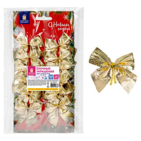 В наборе 24 бантика золотистого цвета. Размер украшений - 5x5 см. Материал - полиэстер. Упакованы в пакет с европодвесом.