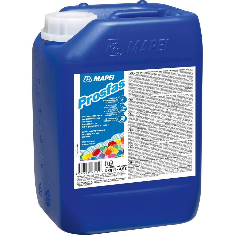 Укрепляющая пропитка с высокой проникающей способностью на основе силикатов, без содержания растворителей, для цементных оснований. Подходит для внутренних и наружных работ. Prosfas представляет собой водный раствор силикатов с низкой вязкостью, что обеспечивает ему высокие проникающие свойства. Он может проникать на глубину нескольких сантиметров, улучшая когезионные характеристики цементных оснований после высыхания. Prosfas повышает твердость, износостойкость, прочность и морозостойкость бетона, улучшает водонепроницаемость. Prosfas готов к использованию и не требует разбавления водой. Prosfas применяется в следующих случаях: Для внутренних и наружных работ на промышленных и гражданских объектах, в т.ч. в транспортном строительстве на терминалах, мостах, взлетно-посадочных полосах, паркингах и других объектах Глубокое укрепление цементных оснований с непрочной поверхностью или со слабыми механическими характеристиками Укрепление цементных стяжек, которые имеют крошащуюся поверхность, вследствие дефектов гидратации или отсутствия вяжущего Пропитка и обеспыливающая грунтовка для бетонных поверхностей и стяжек