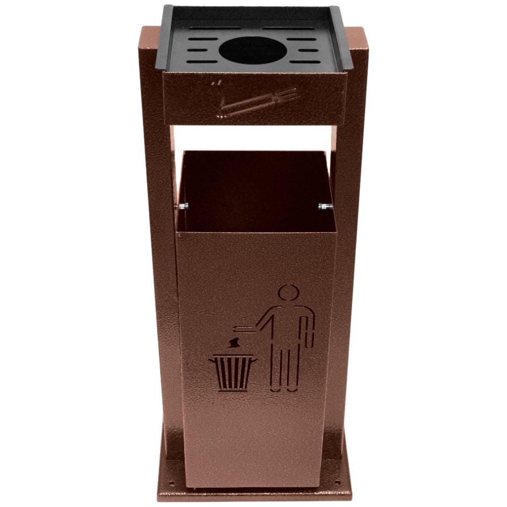 Урна с пепельницей 40л. металлическая уличная, отлично впишется в любой архитектурный ландшафт и легко устанавливается на улицах города, возле подъездов, во дворах, парках, на торговых площадках, на остановках и т.д. Основной мусорный бак опрокидывается. Урна переносная, но есть возможность закрепить её в асфальт, бетон, землю ( предусмотрены отверстия для крепления).Высота 850 мм, ширина 370, глубина 250 мм, толщина металла 1,5 мм. Размеры самого бака 240*240*550 мм. Покрытие — порошковая окраска. Недорогая и надежная металлическая урна не только сэкономит ваш бюджет, но и поддержит чистоту на дачном участке и в общественных местах: во дворе многоэтажки, в сквере или парке, на детской площадке. Урна выполнена из стали, что позволяет использовать как внутри помещений, так и на улице, даче, в саду, в хозяйстве, для любых видов бытовые отходов. Данная модель отличаются прочные креплением, держателем и долговечностью конструкции. Главное преимущество урны - удобная и функциональная конструкция, стильный дизайн, качественный материал. Ножки можно закрепить анкерами к земле, а основной бак - легко опрокидывается. Это позволяет быстро очищать урну. Отлично подойдёт как подарок на новоселье, подарок родителям на дачу, или как подарок друзьям в частный дом.