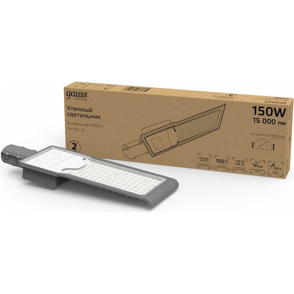 Уличный светодиодный консольный светильник Gauss серии "Avenue" предназначен для освещения автомобильных дорог с малой и средней интенсивностью движения, освещения улиц, дворов, парковых аллей и придомовых территорий рекомендуется использовать светодиодные светильники с распределением КСС типа «Ш» (широкая). Такими характеристиками обладают консольные уличные светильники серии "Avenue". Также светильник защищен от импульсных помех. Это важно, учитывая внешние факторы. Импульсные помехи в сети довольно распространены, они могут возникать во время грозы, при включении/выключении мощных нагрузок. Корпус оснащен анодированным алюминием. Технология анодирования добавляет к светильнику свойства коррозийной стойкости и сопротивление к механическим воздействиям.