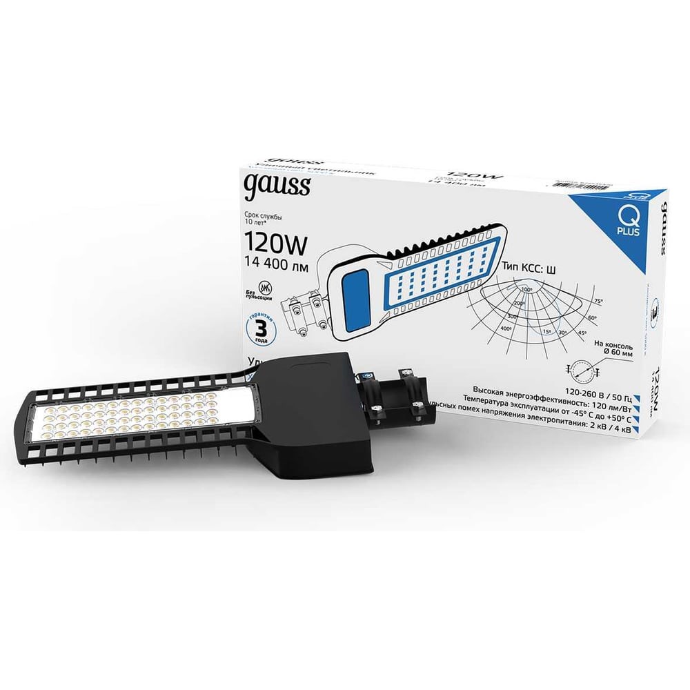 Современный консольный уличный светодиодный светильник Gauss серии Qplus — это практичное и экономичное решение для освещения автомобильных дорог, дворов жилых и коммерческих территорий, зданий, строительных площадок, производственных объектов, автозаправочных станций, зон погрузки/разгрузки товаров, автостоянок и перехватывающих парковок. Такие светильники пришли на смену широко применявшимся ранее светильникам серий ГКУ, РКУ и ЖКУ. Дизайн корпуса светильника цельнометаллический разборный, выполнен из литого под давлением алюминиевого сплава и покрыт антикоррозийной матовой краской чёрного цвета. В основании корпуса имеется сопло под трубу с 4 фиксирующими болтами для монтажа светильника на консольный кронштейн.