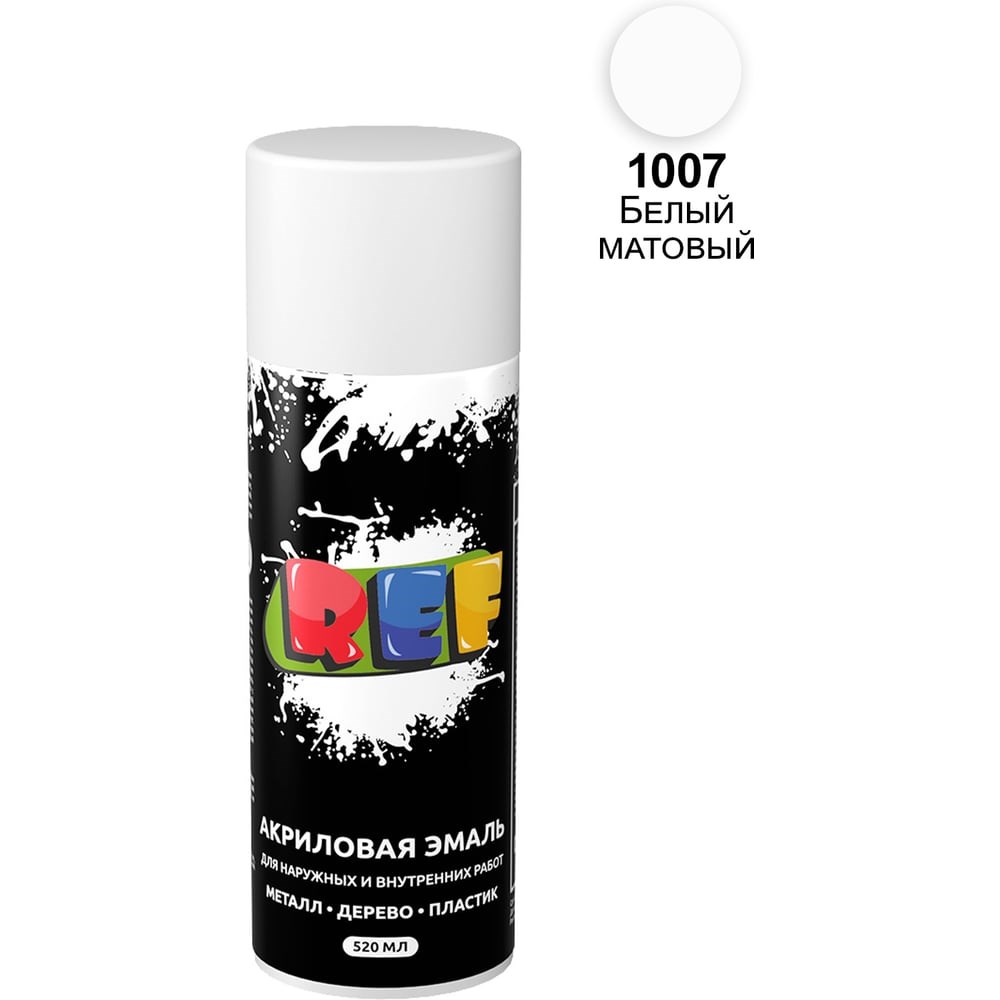 Акриловая универсальная эмаль REF белый, матовый 520 мл 1007 предназначена для защитно-декоративного окрашивания различных поверхностей внутри и снаружи помещений. Продукт широко используют во время строительных работ, ремонта автомобилей и оформления интерьеров. Быстросохнущий состав отличается высокой укрывистостью и хорошей адгезией к большинству материалов (металл, дерево, пластик). Краска образует равномерное покрытие, устойчивое к механическим (удары, износ, царапины, изгибы) и неблагоприятным атмосферным (осадки, перепады температуры, ультрафиолет) воздействиям.