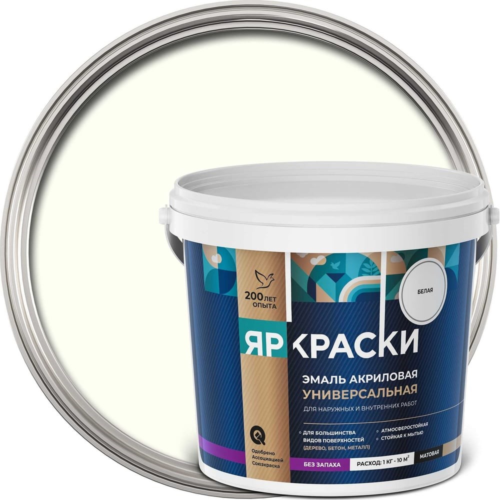 Эмаль ЯРОСЛАВСКИЕ КРАСКИ белая матовая, ведро О05191 акриловая универсальная широкого диапазона использования. Экологически безопасна для окружающей среды и здоровья человека. Удобна в работе: хорошо разравнивается, не образует потеков. Покрытие эмали обладает хорошим сцеплением с поверхностями. После высыхания образует идеальное гладкое покрытие, устойчивое к мытью бытовыми моющими средствами. Для окрашивания снаружи и внутри помещений, во всех типах зданий и сооружений, как новых, так и ранее окрашенных деревянных поверхностей, ДВП, ДСП, а также бетона, кирпича, штукатурки, гипсокартона, обоев под покраску.