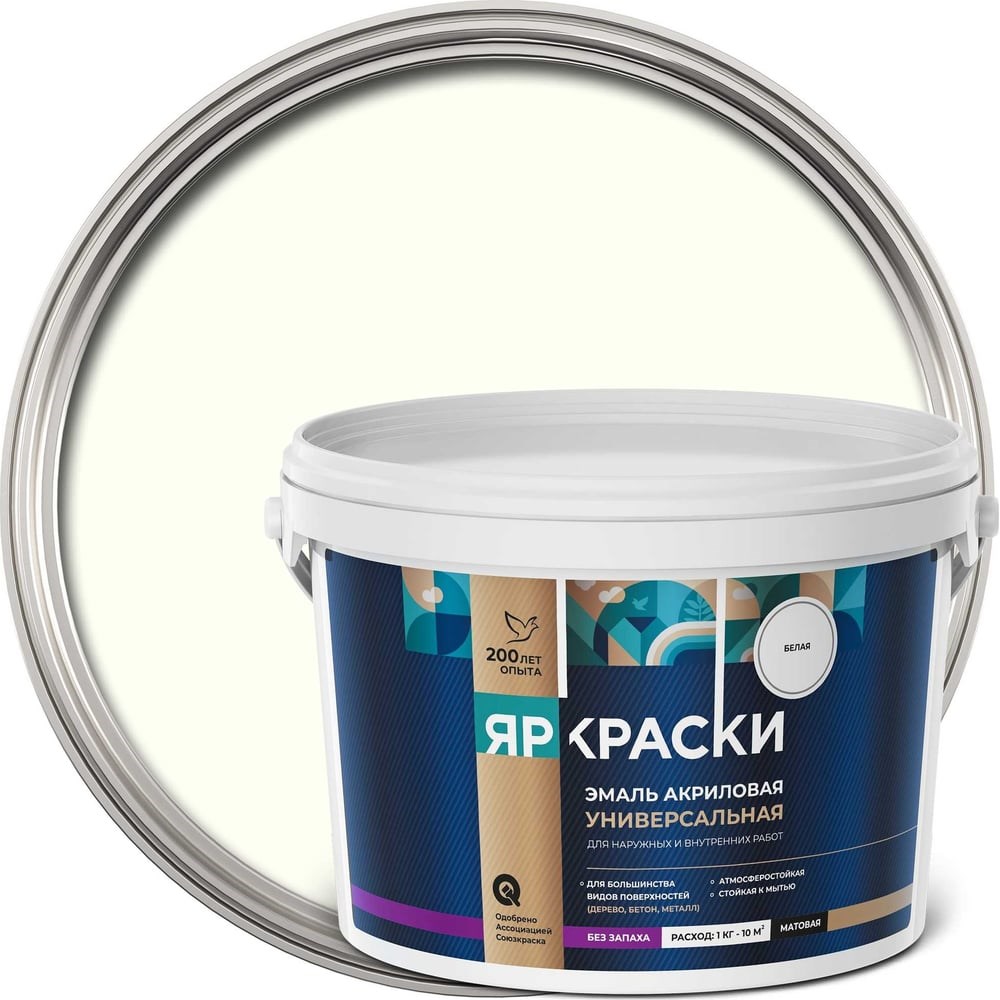 Эмаль ЯРОСЛАВСКИЕ КРАСКИ белая матовая, ведро О05197 акриловая универсальная широкого диапазона использования. Экологически безопасна для окружающей среды и здоровья человека. Удобна в работе: хорошо разравнивается, не образует потеков. Покрытие эмали обладает хорошим сцеплением с поверхностями. После высыхания образует идеальное гладкое покрытие, устойчивое к мытью бытовыми моющими средствами. Для окрашивания снаружи и внутри помещений, во всех типах зданий и сооружений, как новых, так и ранее окрашенных деревянных поверхностей, ДВП, ДСП, а также бетона, кирпича, штукатурки, гипсокартона, обоев под покраску.