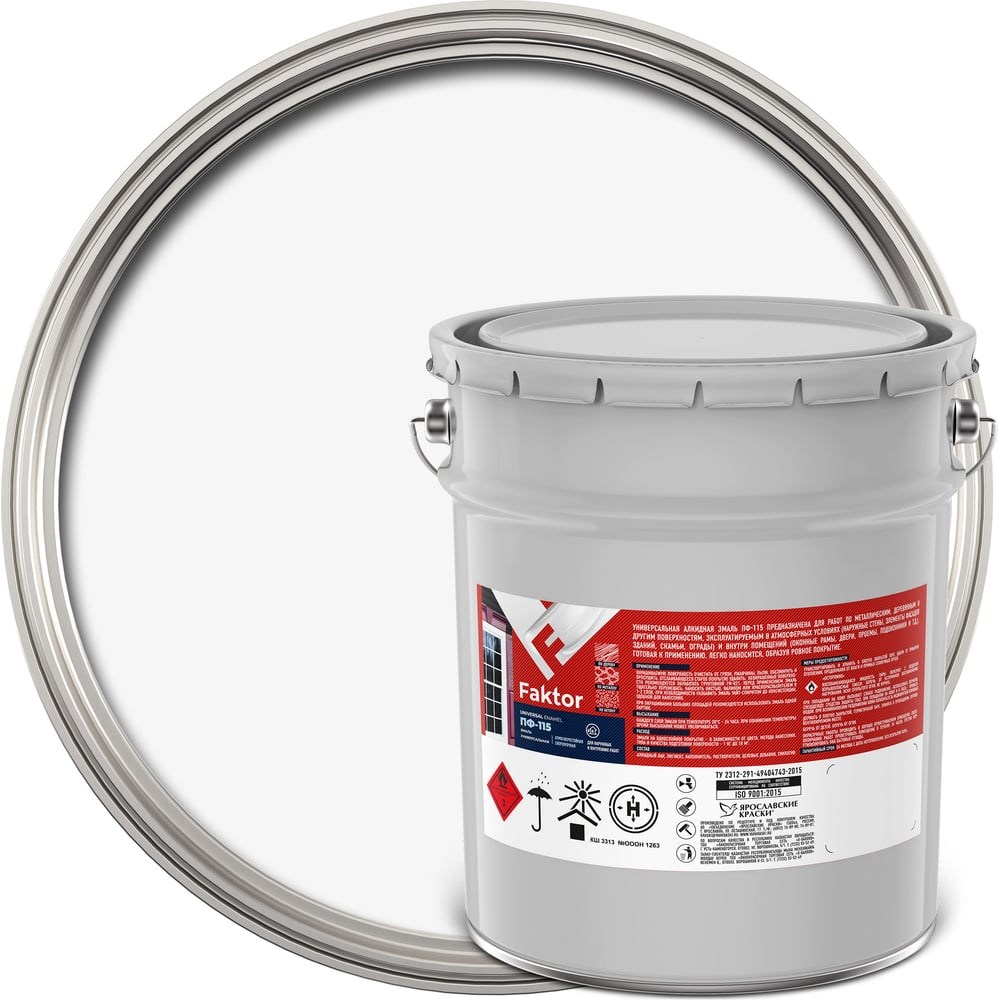 Эмаль ЯРОСЛАВСКИЕ КРАСКИ FAKTOR ПФ-115 белая, барабан 20 кг 214711 универсальная сверхпрочная предназначена для окрашивания металлических, деревянных и бетонных поверхностей, эксплуатируемых в атмосферных условиях и внутри помещений (наружные стены, элементы фасадов, скамьи, ограды, оконные рамы, двери, проемы, подоконники и т. д.) После высыхания образует особо прочное полуматовое покрытие, стойкое к атмосферным воздействиям и перепадам температур.