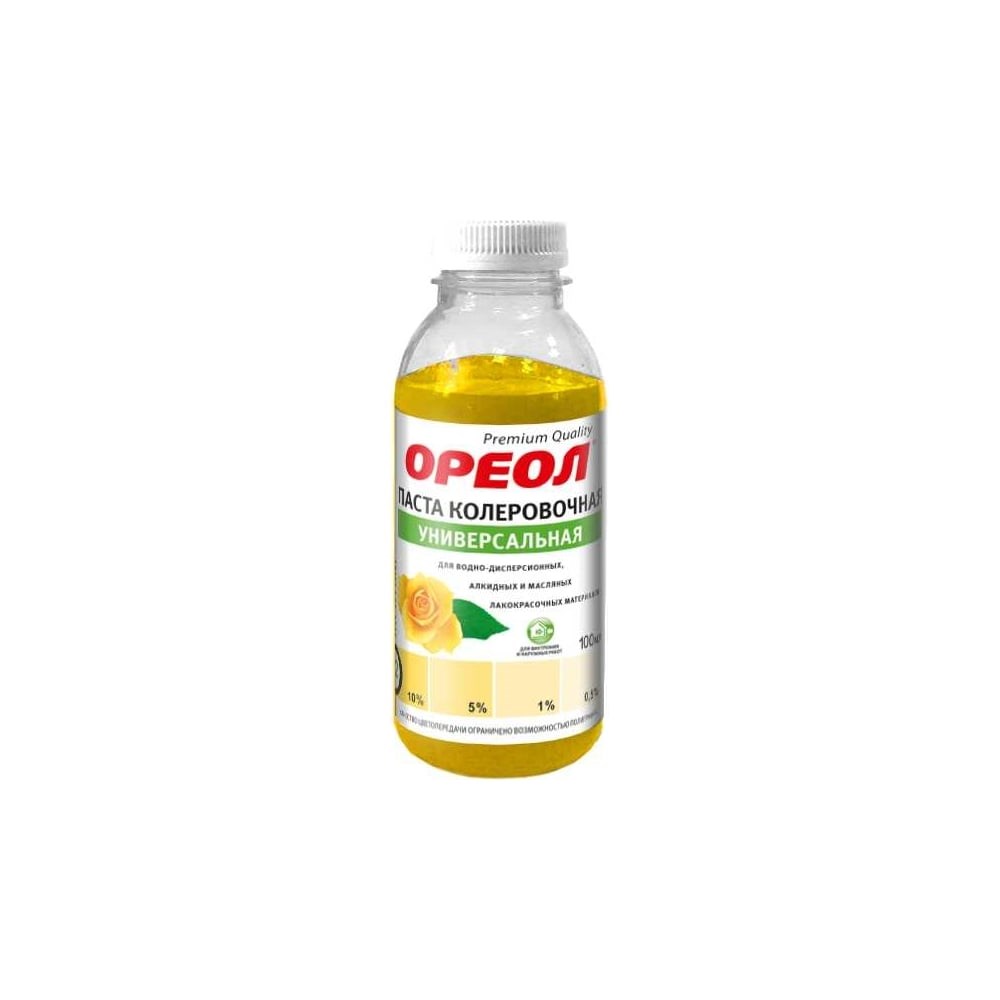 Универсальная колеровочная паста ОРЕОЛ желтый (02), 100 мл 4768 предназначена для ручного колерования красок, эмалей, лаков, сухих строительных смесей, растворов, побелочных и других составов на водной и органической основе. Для получения равномерно окрашенного материала необходимую порцию пасты ввести в небольшое количество краски и тщательно перемешать. Затем полученную смесь добавить при постоянном перемешивании в остальную часть краски и вновь тщательно перемешать до получения однородной по цвету массы. Рекомендуется вводить в краску не более 5% пасты. Внимание! Не использовать как самостоятельное красящее вещество.