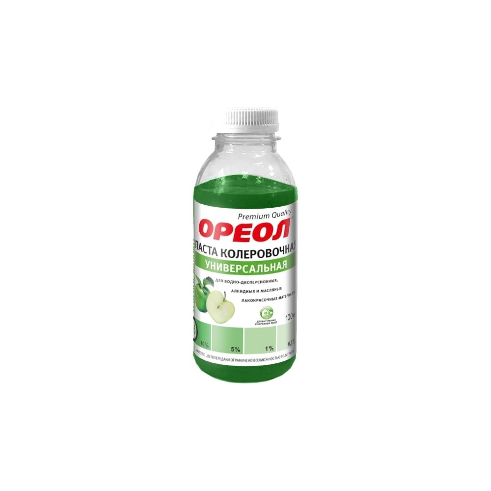 Универсальная колеровочная паста ОРЕОЛ зеленое яблоко (25), 100 мл 4769 предназначена для ручного колерования красок, эмалей, лаков, сухих строительных смесей, растворов, побелочных и других составов на водной и органической основе. Для получения равномерно окрашенного материала необходимую порцию пасты ввести в небольшое количество краски и тщательно перемешать. Затем полученную смесь добавить при постоянном перемешивании в остальную часть краски и вновь тщательно перемешать до получения однородной по цвету массы. Рекомендуется вводить в краску не более 5% пасты. Внимание! Не использовать как самостоятельное красящее вещество.