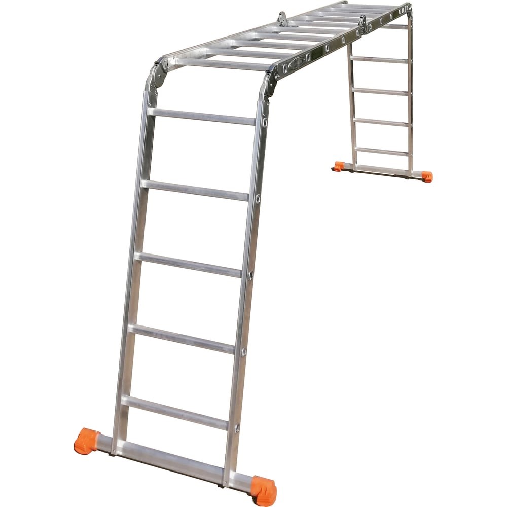 Универсальная лестница Эйфель Простор 4х5 изготовлена из окрашенного алюминиевого профиля, поэтому имеет небольшой вес и высокую прочность. Модель часто используют в работе маляры, штукатуры и отделочники. Подходит для выполнения работ на высоте до 6,51 метров. Поперечные перекладины с противоскользящим основанием обеспечивают устойчивость лестницы на любой поверхности. Предусмотрена возможность изменения конфигурации, что делает лестницу многофункциональной.За счет своей универсальности может использоваться как стремянка, как приставная лестница (в 2 вариантах) и как помост.В варианте “помост” необходимо использовать платформу (приобретается опционально). Шарниры позволяют фиксировать лестницу в нужном исполнении.За счет увеличенной ширины позволяет в положении “помост” ставить возле ног ведро, не создавая препятствий для перемещения.