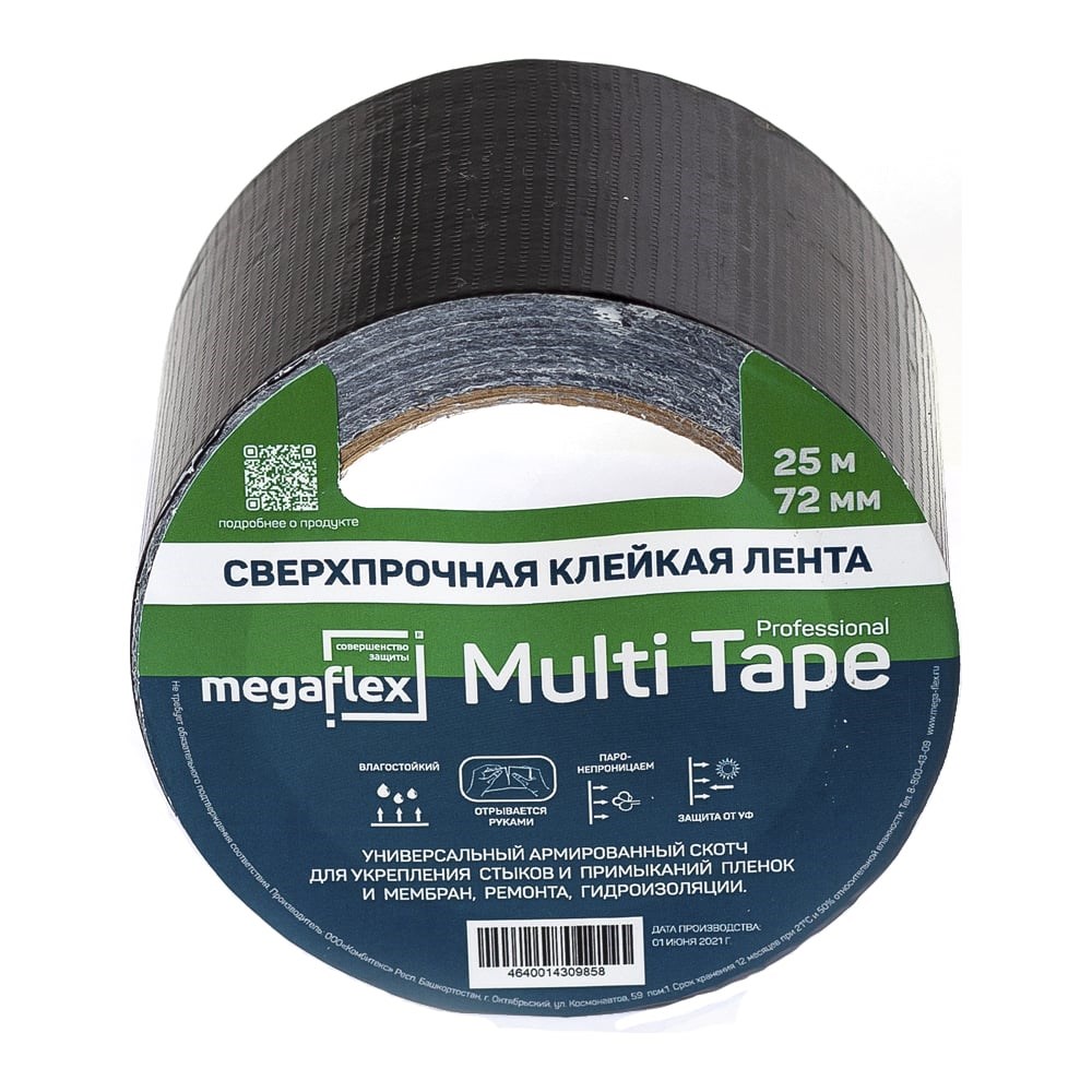 Универсальная сверхпрочная клейкая лента Megaflex multi tape 72 мм, 25м MEGMU.72.25 состоит из слоя каучукового клея и стеклотканевой основы, которая покрывается слоем полипропилена. Армированная клейкая лента легко выдерживает как высокие, так и низкие температуры, отличается повышенной прочностью и долговечностью, применяется для разных поверхностей и материалов, в том числе шероховатых и неровных. При этом клейкая лента TPL устойчива к разрывам и растяжениям, но при этом можно оторвать ее руками, на ленте можно делать различные пометки.Применение в строительстве: для герметизации стыков и примыканий пленок и мембран на стенах, кровлях и перекрытиях (кровельная лента), для ремонта трещин и проколов, защитит от влаги и пара.В промышленности: для сантехнических работ, герметизации отопления и вентиляции, ремонта лопнувших труб, обматывания труб - укрепления щелей и стыков, устранения протечек.В быту: для авторемонта деталей, ремонта бытовых предметов, спортивного инвентаря, ремонта книг, надувных бассейнов, садового инвентаря, резиновых шлангов, крепления коврового покрытия и т.д. Может использоваться для контрольной запечатки коробок (благодаря очень высокой клейкости ленты, вскрытая коробка сразу же будет видна), для повышения прочности и безопасности зеркал (наклеивается на обратную сторону зеркала, что увеличивает его прочность и в случае, если зеркало разобьется, осколки не разлетятся). Лента Multi Tape используется в процессе замены автомобильных стекол для их фиксации.