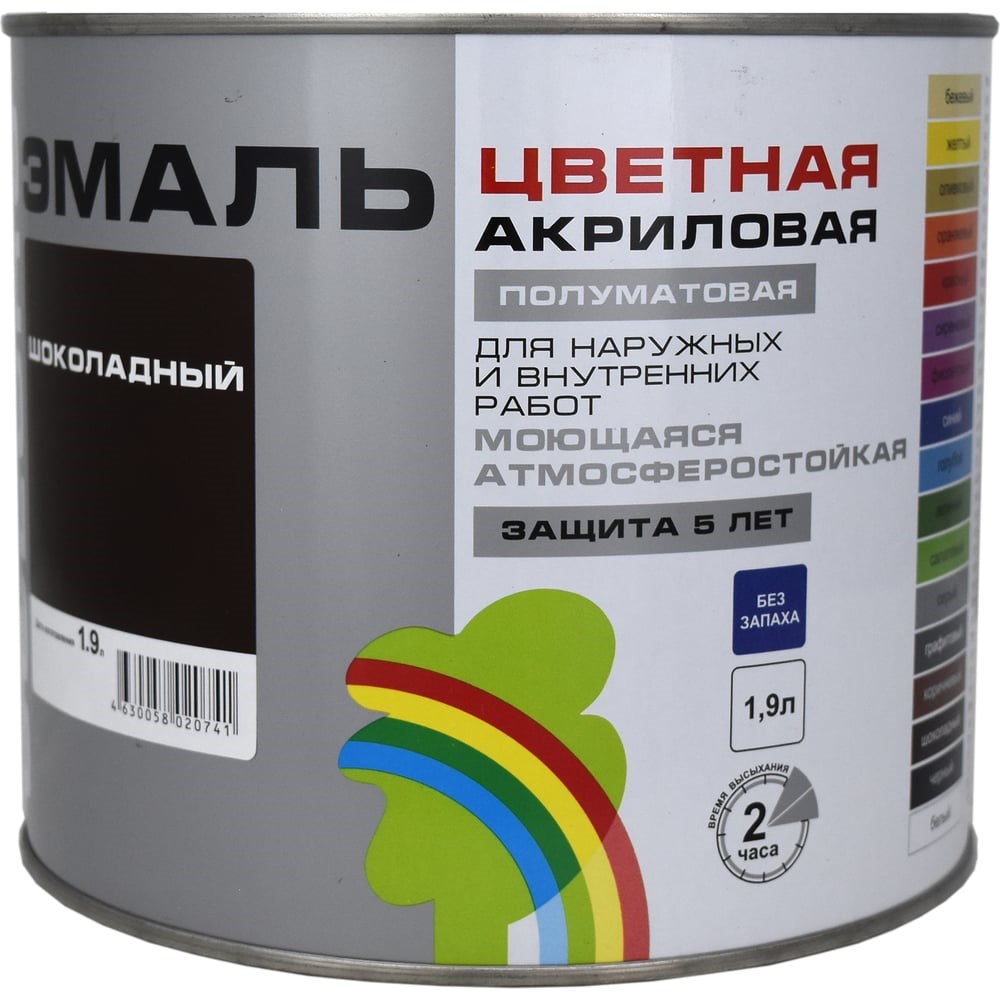 Универсальная цветная эмаль Радуга Colors ВД-АК 220 шоколадный, 1,9 л 144931 применяется для нанесения на поверхности: кирпичные, бетонные, деревянные, металлические, гипсокартонные. Продукт обладает атмосферостойкими свойствами, поэтому может быть использован для наружных и внутренних работ. Состав на акриловой основе не токсичен, безопасен для здоровья. Возможность смешивания стандартных цветов эмали Colors Радуга позволяет получить необходимый оттенок. Хорошая укрывистость позволяет создать однотонное, ровное покрытие. Продукт наносят на предварительно обработанную поверхность. Технические характеристики: Хранить при температуре: от +5°С до +30°С.