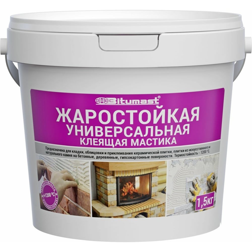 Жаростойкая универсальная клеящая мастика Bitumast 1,5 кг 4607952905498 предназначена для укладки и облицовки печей и каминов с повышенной температурой эксплуатации (до +1200°С). Экологически безопасный состав без запаха обладает экономичным расходом (до 1.7 кг/м2). Продукт подходит для приклеивания фанеры, кафельной, гипсовой и пенополистирольной потолочной плитки, линолеума и ковролина (войлочная или джутовая основа). Мастика имеет хорошую адгезию к большинству оснований: стекло, дерево, картон, бетон, кирпич, штукатурка, шпатлевка, натуральный и искусственный камень. Внимание! Не рекомендуется использовать для поверхностей, подверженных контакту с водой.