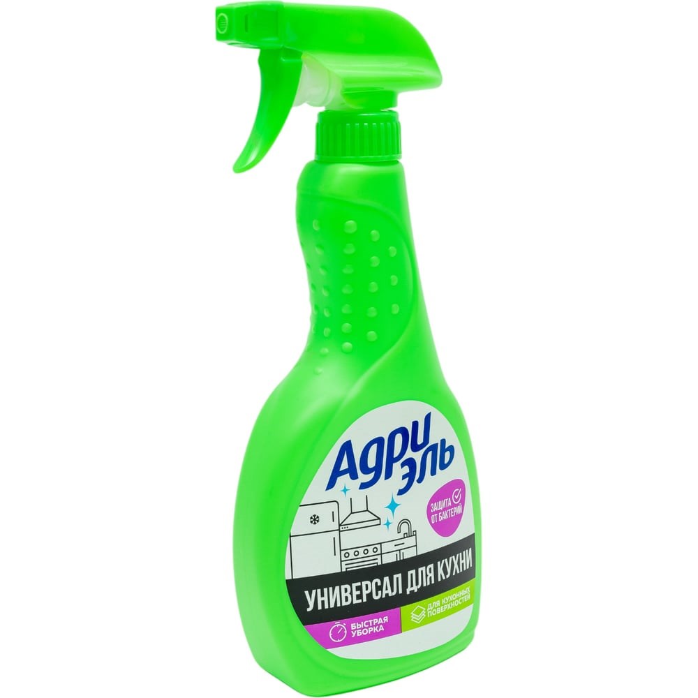 АДРИЭЛЬ Спрей для кухни Универсал 500 мл предназначено для очистки поверхностей.Универсальное чистящее средство для кухни. Удаляет жир, грязь, пыль, пигментные загрязнения. Подходит для регулярной уборки плиты, стола, кухонной столешницы, кафельной плитки, кухонных принадлежностей, СВЧ- печи, пластика, ПВХ, МДФ, поверхности холодильника, вентиляционной вытяжки, мусорного ведра. Безопасно для любых поверхностей, включая дерево, мрамор, стеклокерамику, алюминий. Легкий цитрусовый аромат.Благодаря эффективному составу справляется с трудными загрязнениями.Не токсично, за счет чего безопасно для здоровья.Благодаря специальной концентрированной формуле и активным действующим компонентам экономичен в использовании.Условия хранения: Хранить отдельно от пищевых продуктов, в недоступном для детей месте, при температуре от 5 С до 25 С.