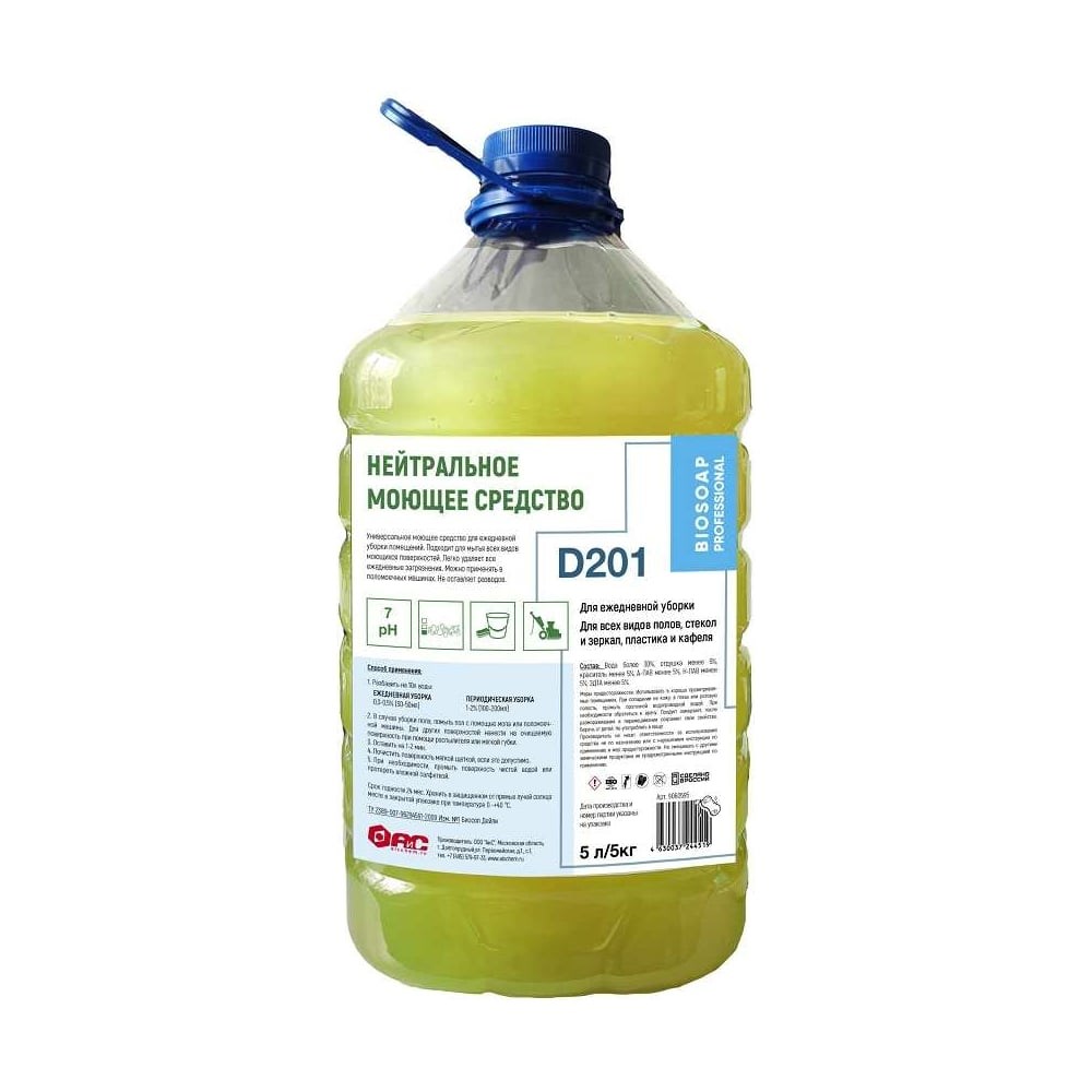 Универсальное моющее средство АиС BIOSOAP Proffecional 5 л 9060595 подходит для ежедневной уборки всех моющихся поверхностей. Легко удаляет все ежедневные загрязнения. Можно применять в поломоечных машинах. Не оставляет разводов.Применение:Разбавить водой: ЕЖЕДНЕВНАЯ УБОРКА 0,3-0,5% (30-50мл на 10л воды); ПЕРИОДИЧЕСКАЯ УБОРКА 1-2% (100-200мл на 10л воды).В случае уборки пола, помыть пол с помощью мопа или поломоечной машины. Для других поверхностей нанести на очищаемую поверхность при помощи распылителя или мягкой губки.Оставить на 1-2 мин.Почистить поверхность мягкой щеткой, если это допустимо. При необходимости, промыть поверхность чистой водой или протереть влажной салфеткой.