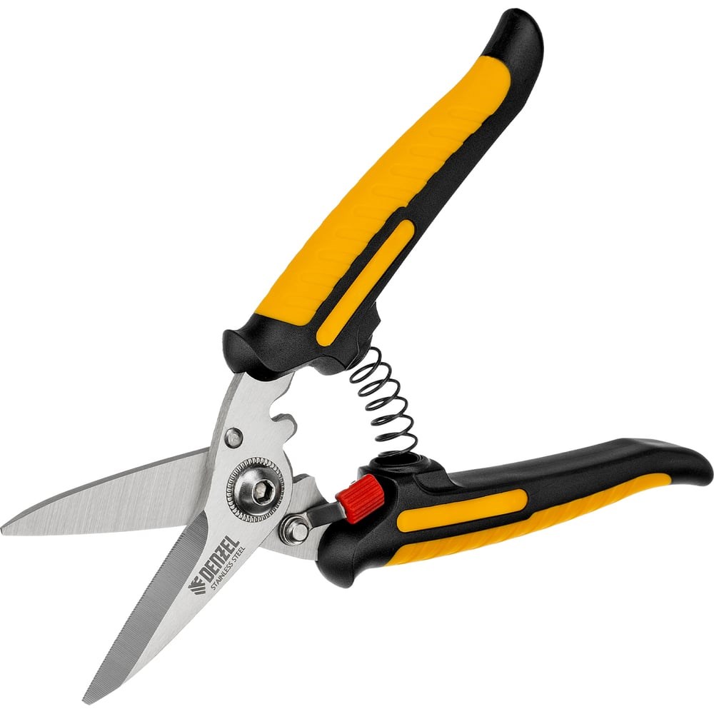 Ножницы Denzel универсальные предназначены для резания тонкого метала и мягких листовых материалов. Благодаря специальной насечке разрезаемый материал фиксируется между лезвиями. Лезвия из нержавеющей стали долго сохраняют рабочие свойства. Фиксирующий болт позволяет регулировать зазор между полотен. Двухкомпонентные рукоятки с рельефной поверхностью обеспечивают надежный хват и комфорт во время работы. Толщина разрезаемого материала: Сталь - 0,5мм Медь - 0,5мм Алюминий - 1мм Пластик - 2мм Резина - 5мм Кожа - 5мм