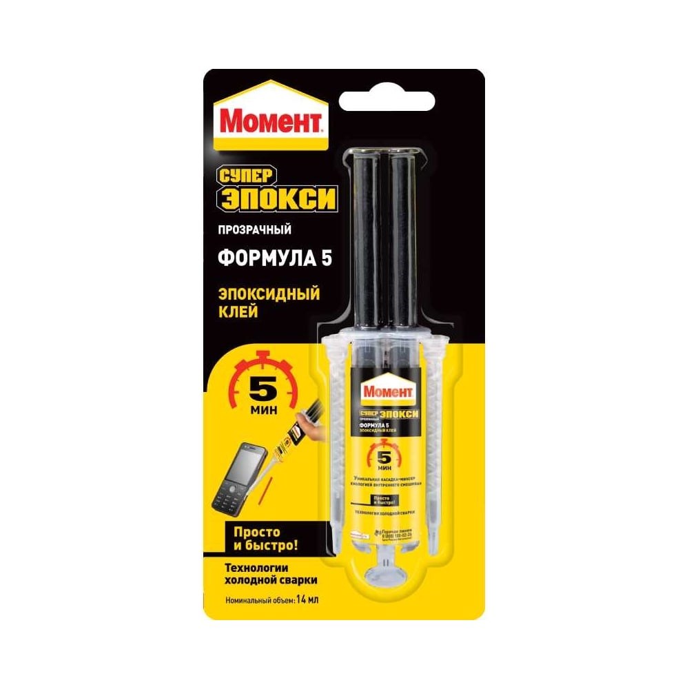 Универсальный эпоксидный клей МОМЕНТ Супер ЭПОКСИ Формула 5 прозрачный 14 мл шприц Б0022995 2751324 - надежный и быстрый эпоксидный клей в шприце с насадкой-миксером, который застывает за 5 минут. Клей сразу готов к применению. Специальная насадка-миксер с технологией внутреннего смешивания обеспечивает быстрое и правильное премешивание компонентов. Обеспечивает высокую теплостойкость, не дает усадку и не расширяется при отверждении, 100% водостойкий, обладает высокой устойчивостью к воздействию масел и растворителей Подходит для комбинационнго склеивания стекла, стекловолокна, фарфора, керамики, фаянса, хрусталя, металла, дерева. Склеивания с последующей обработкой мрамора, камня, бетона, всех видов металла и их сплавов, жесткого ПВХ, полистирола, оргстекла, поликарбоната, полиамида, АБС- и других пластиков. Идеально подходит для восстановления недостающих частей, для заполнения, вмятин, сколов, трещин. Подходит для реставрации всех видов строительных материалов, плитки, мрамора, цемента, камня, бетона, кирпича, природных и искусственных камней и т.д.