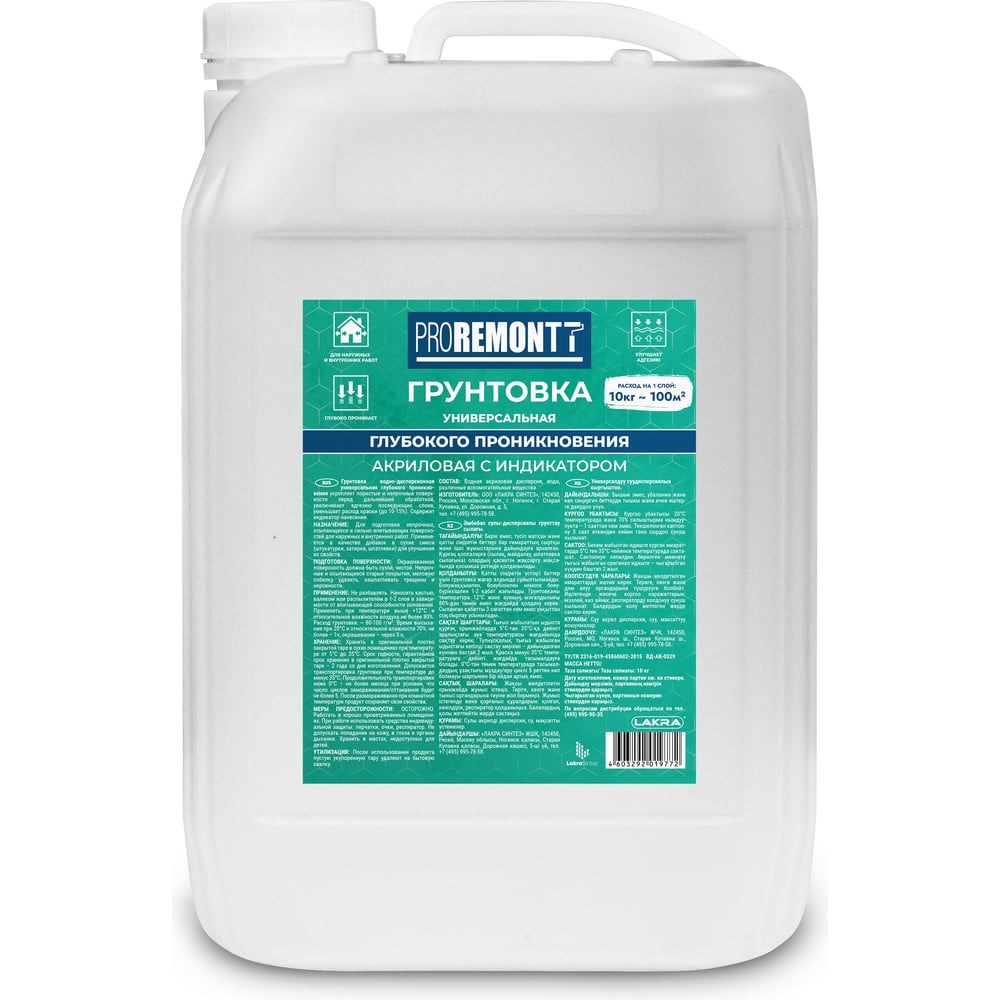 Универсальный грунт Proremontt с индикатором, 10 кг Лк-00004534 предназначена для подготовки непрочных, осыпающихся и сильно впитывающих поверхностей. Применяется для пропитки бетонных, кирпичных, оштукатуренных и других поверхностей снаружи и внутри помещений. Расход: 80 - 100 г/кв. м.
