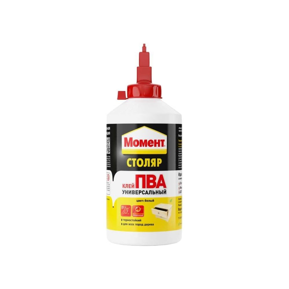 Универсальный клей МОМЕНТ Столяр ПВА 750 г Б0023001 1960504 на основе водной дисперсии ПВА, подходящий для всех пород дерева. Высокая прочность склеивания. Не окрашивает дерево. Термостойкий. Прозрачный шов после высыхания. Предназначен для склеивания всех пород дерева, ДСП, ДВП, МДФ, многослойной фанеры, декоративного бумажно - слоистого пластика и шпона.