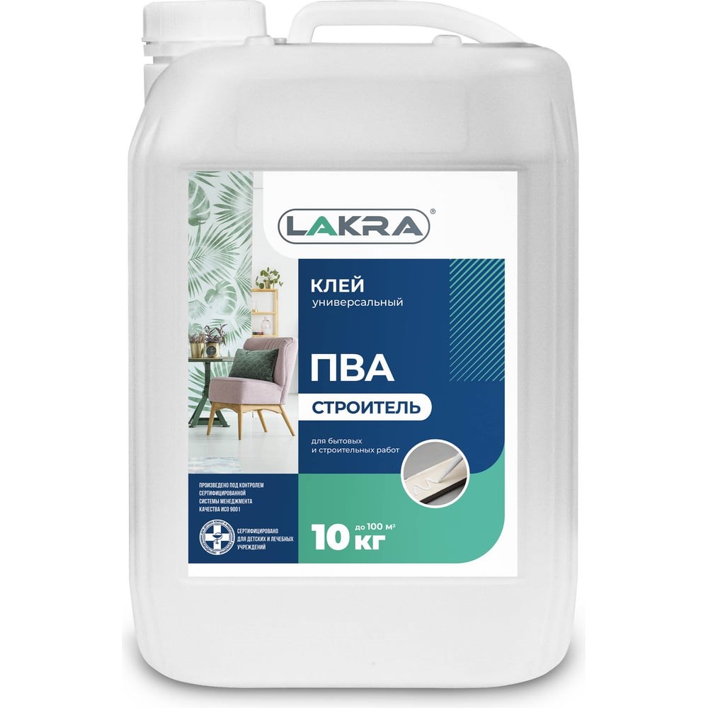 Универсальный клей ПВА Лакра Строитель канистра 10 кг 90001343010 используют для надежного склеивания различных материалов: картон, бумага, ткань, декоративная пленка (клеенка). При помощи продукта приклеивают строительные элементы (серпянка), подклеивают обои на бумажной основе. Состав имеет оптимальное время отверждения и после высыхания образует прозрачное эластичное клеевое соединение высокой прочности.