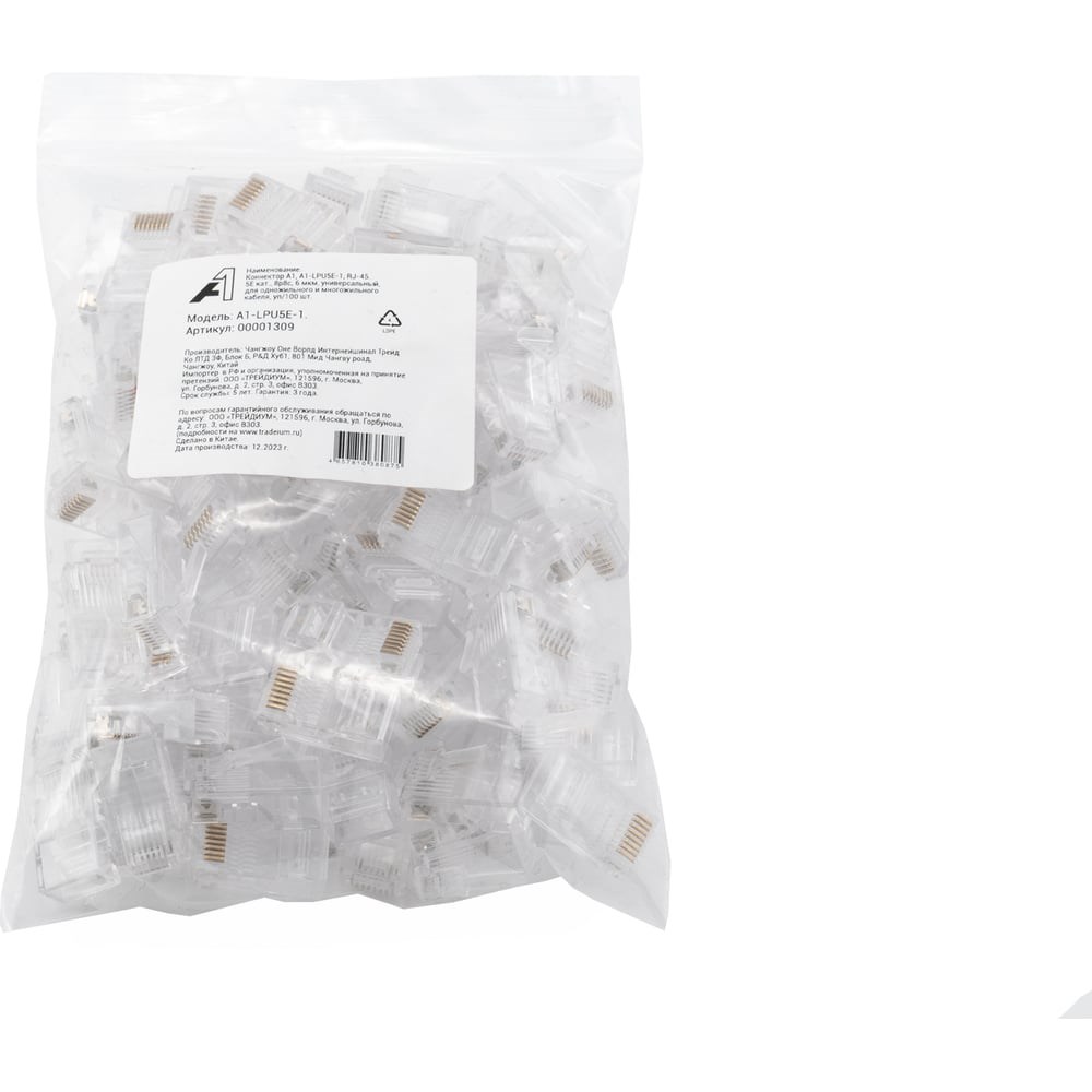 Коннектор A1 A1-LPU5E-4 RJ-45, 5E кат., легкая установка, 8p8c, 6 мкм, универсальный, для одножильного и многожильного кабеля, упаковка/100 шт A1-LPU5E-1