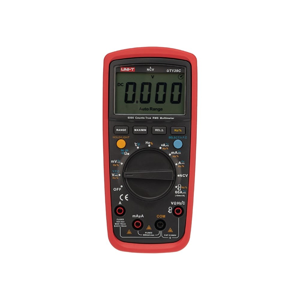 Универсальный мультиметр UNI-T UT139C с современным дизайном, большим дисплеем, подходит для измерения напряжения, силы тока, сопротивления, емкости, частоты и температуры. Обладает высоким классом точности. Имеет режим измерения среднеквадратичных значений TRUE RMS, бесконтактный детектер напряжения NCV. Дисплей с подсветкой облегчает работу в слабоосвещенных местах. Благодаря удобному регулятору все переключения можно производить даже одной рукой. Выбор диапазона измерения производится автоматически или вручную. Модель имеет режим измерения токов до 60 А при подключении внешних токовых клещей.