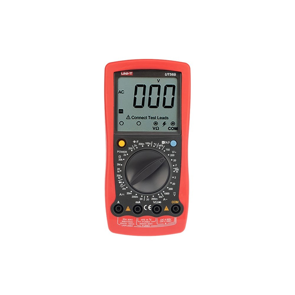 UT58B — это профессиональный мультиметр с современным и эргономичным дизайном. Предназначен прибор для измерений постоянного и переменного напряжения, сопротивления, постоянного и переменного тока. Кроме того, он имеет функции измерения электрической емкости и температуры, а также с его помощью вы сможете тестировать диоды и проводить прозвонку целостности цепи. Данный прибор обладает высоким классом точности показаний.Дисплей прибора оснащен подсветкой, которая позволяет проводить измерения даже в слабоосвещенных местах. Широкий функционал мультиметра UT50B позволяет обходиться без других вспомогательных устройств. Прибор оснащен функцией DATA HOLD, и зафиксировав результат измерений, вы в любое время сможете считать полученный значение. Прибор изготовлен из высококачественных материалов. Калибровка и тестирование приборов произведены под контролем компании СДС.Инженеры старались сделать прибор максимально удобным для использования, и сужение в нижней области корпуса позволяет удобнее располагать прибор в одной руке, а шероховатость корпуса предотвращает выскальзывание. Все переключения удобно производить даже одной рукой, но, несмотря на это, у прибора усиленный поворотный регулятор, благодаря которому исключается возможность случайного нажатия.