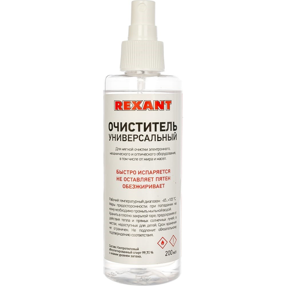 Универсальный очиститель с распылителем REXANT 200 мл 09-4105 предназначен для очистки или обезжиривания различных предметов. Применяется для очистки радиоэлектронных элементов, оптического оборудования, при монтаже и обслуживании волоконно-оптических кабелей, в бытовых нуждах и для других целей. Представляет собой бесцветную прозрачную жидкость с характерным запахом. Очиститель быстро испаряется, не оставляет пятен на поверхностях. Состав: абсолютированный изопропиловый спирт 99.6%. Объем — 200 мл.