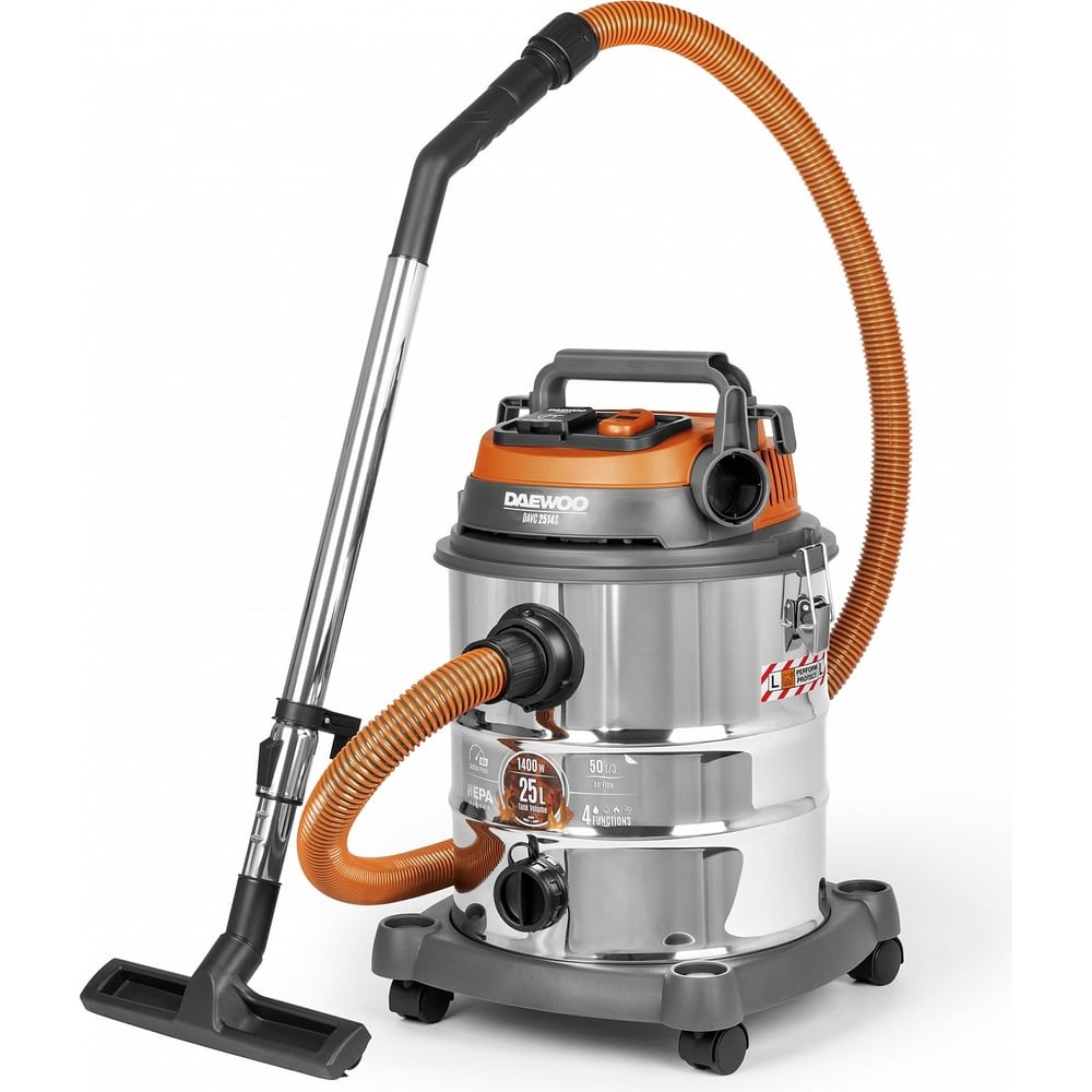 Универсальный пылесос DAEWOO с 2-мя шлангами DAVC 2514S предназначен для очистки помещений во время строительных работ. Корпус из нержавеющей стали устойчив к коррозии и механическим воздействиям. Оснащен двойной системой фильтрации. В комплекте огнеупорный фильтр предварительной очистки и второй фильтр HEPA для сбора самых мелких частиц пыли. Благодаря стойкости к высоким температурам и наличию второго армированного металлического шланга и алюминиевых насадок подходит для сбора золы и не остывших углей. Встроенная розетка позволяет подключать электроинструмент мощностью до 2 кВт. Наличие сливного отверстия позволяет удалить жидкость не переворачивая наполненный пылесос. Работает в 4-х режимах: всасывание сухого строительного и бытового мусора всасывание золы и неостывших углей обдув с высоким потоком воздуха сбор жидкости
