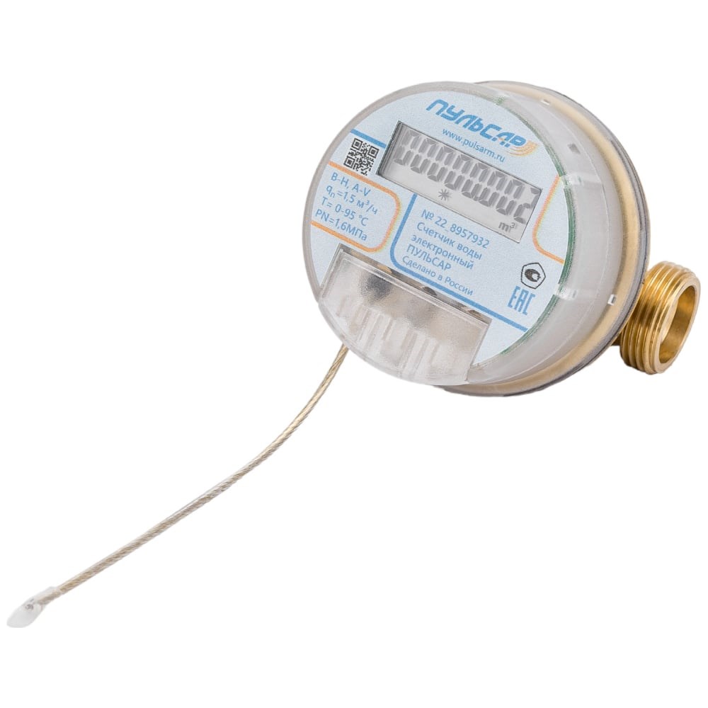 Счетчики воды электронные «Пульсар» предназначены для измерений объема холодной или горячей воды, протекающей в трубопроводах систем холодного и горячего водоснабжения. Принцип работы счетчика состоит в измерении числа оборотов крыльчатки, вращающейся под действием потока протекающей воды. Счетный механизм имеет электронный датчик оборотов крыльчатки. Сигнал с датчика поступает на микропроцессорное устройство, которое вычисляет объем воды, прошедшей через счетчик. Значение объема отображается на индикаторном устройстве.Присоединительный размер - сгон с накидной гайкой - 3/4 дюйма на 1/2 дюйма. Внимание! Дату поверки счетчика можно узнать на сайте РСТ Метрология