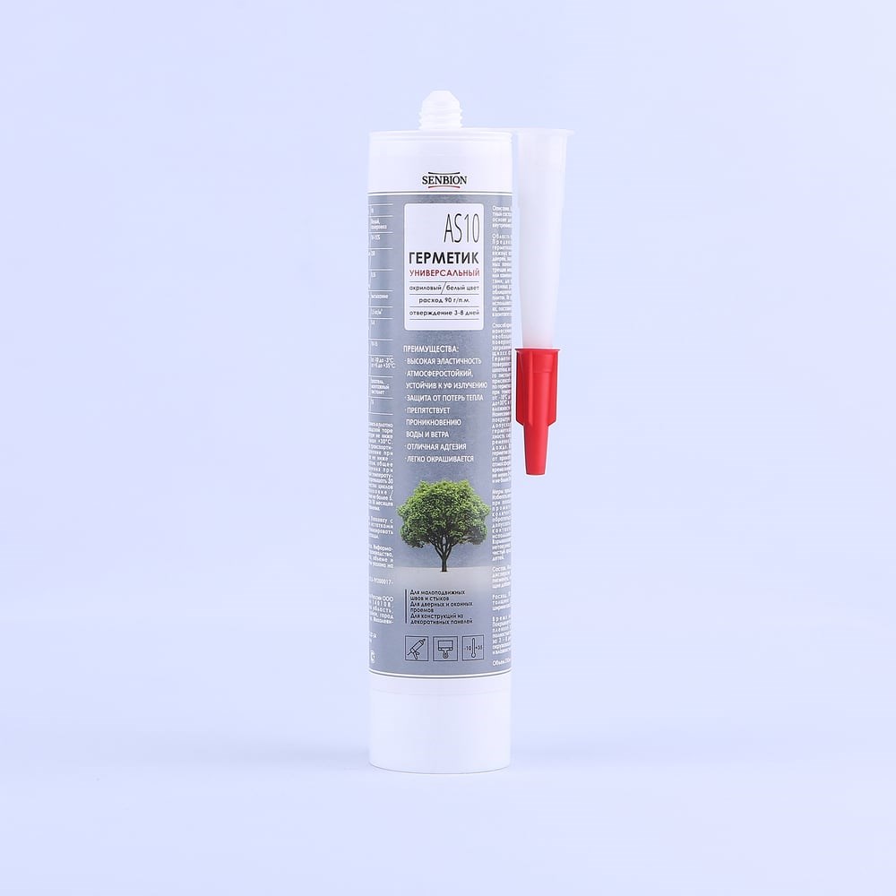 Универсальный строительный герметик SENBION AS-10 (акриловый; белый; 310 мл) SB191/310-Бел представляет собой однокомпонентный состав на акрилатной основе для наружных и внутренних работ. Применяется для герметизации швов и стыков дверей, полов, декоративных панелей, для герметизации оконных рам, расшивки облицовочных и напольных плит. Обладает высокой эластичностью, отличной адгезией и атмосферостойкостью. Устойчив к УФ излучению.