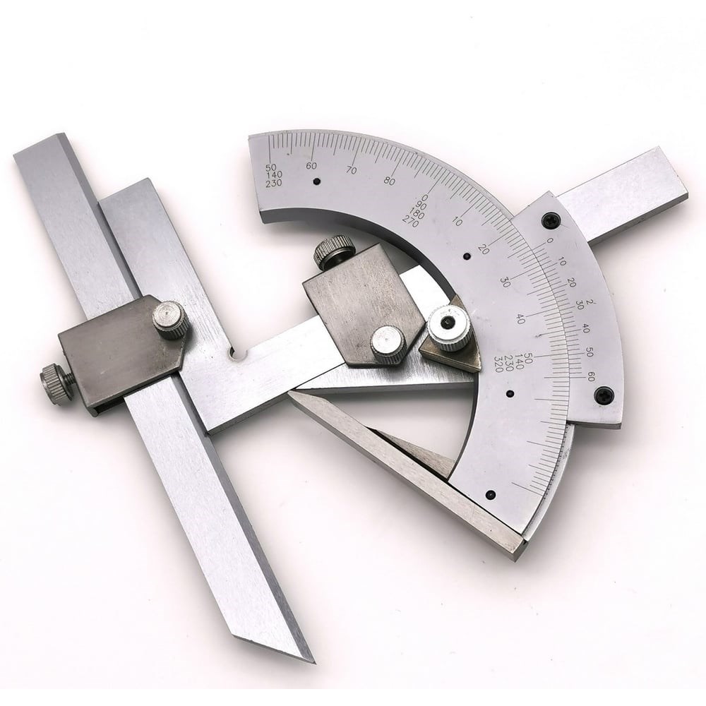 Универсальный угломер 30-320 град BESTELLI AC01200611 для точного измерения углов от 0 до 320. Три степени регулировки обеспечивают удобное применение, а зубчатая передача - точное выставление угла. Разметка угломера с ценой деления 1° и шкалой нониуса в 2'. Устройство изготовлено из нержавеющей стали.