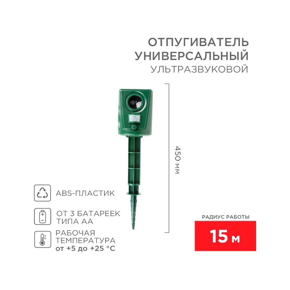 Универсальный ультразвуковой отпугиватель REXANT представляет собой наиболее современную, во многом инновационную модель. Данное устройство снабжено инфракрасным датчиком движения, что значительно повышает удобство и эффективность его работы. Гарантирует вашему участку защиту от «непрошенных гостей».При этом ультразвуковое воздействие не только эффективно, но и гуманно. Устройство отгоняет собак, кошек, белок, кроликов и других средних и крупных животных, просто пугая их, не нанося их здоровью никакого вреда.В комплекте с устройством идёт подставка для установки отпугивателя в грунт, а также крепеж для подвешивания на стену. Для использования внутри помещений и на улице.Дополнительные характеристики:Радиус работы: 15 метров;Питание: 3 батарейки типа АА (в комплект не входят);Частота: 16-60 кГц;Громкость: до 90 дБ;Угол излучения: 110°.