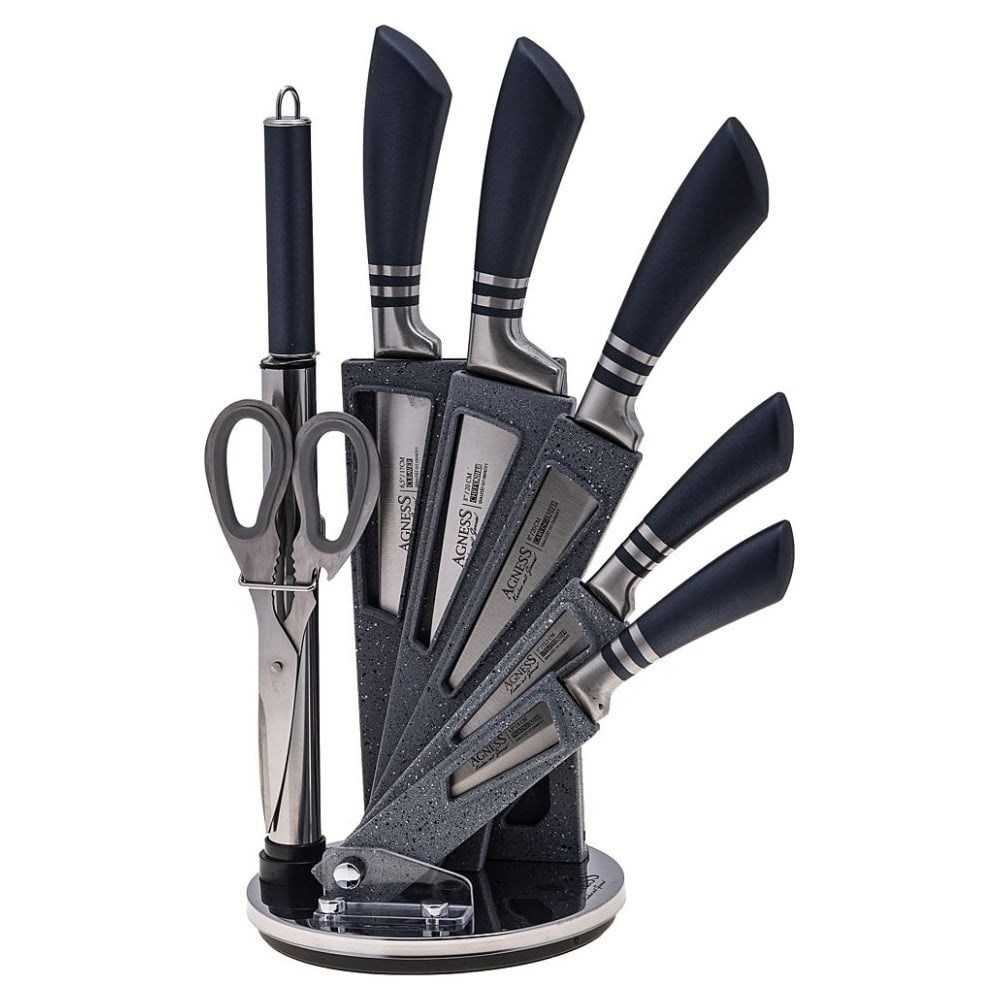 Упаковка ножей Agness с ножницами и мусатом, на пластиковой подставке, 8 предметов 911-642 предназначена для готовки. Лезвие из нержавеющей стали отличается высокой эффективностью. Имеет гладкую поверхность, поэтому легко моется. За счет высокой прочности прослужит долго.