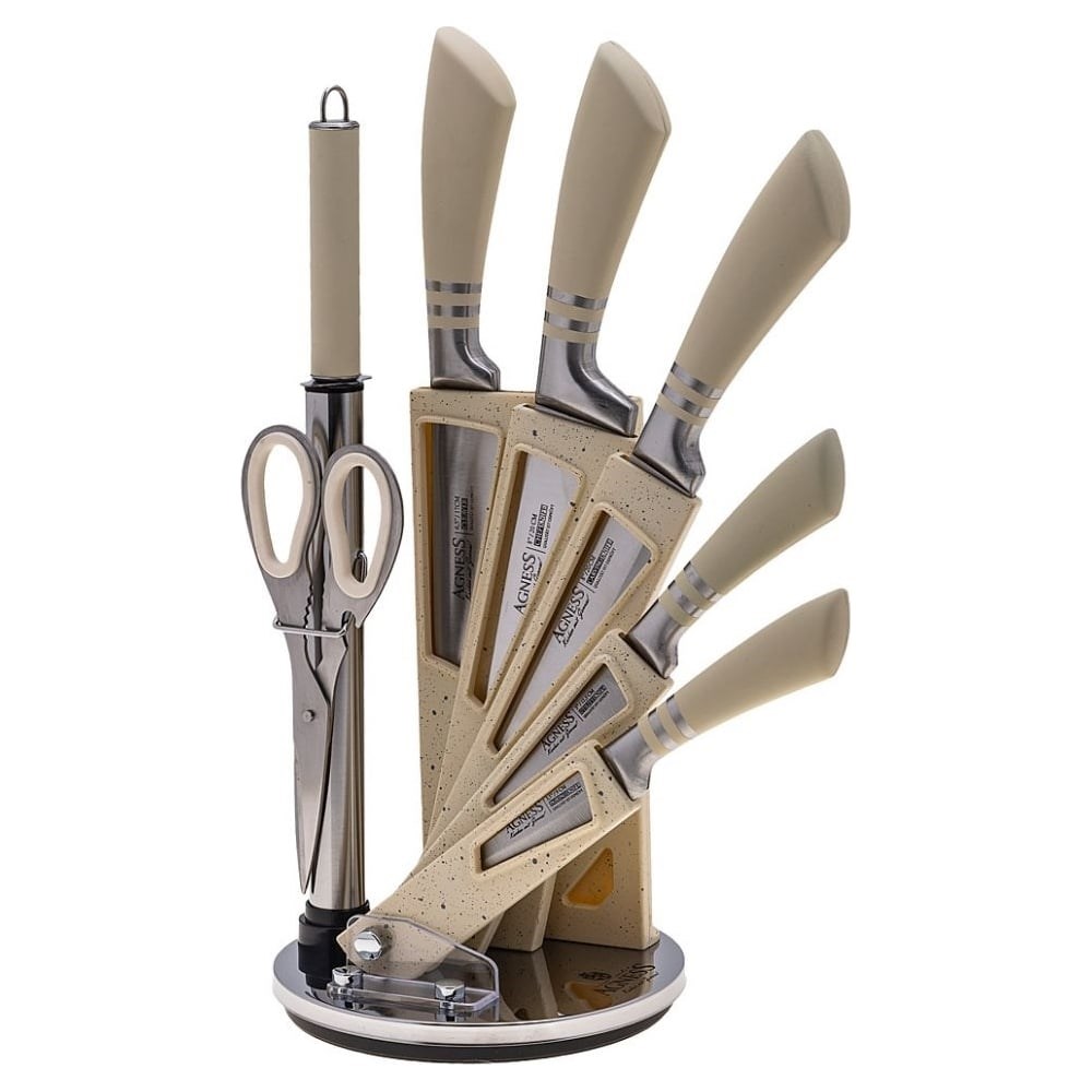 Упаковка ножей Agness с ножницами и мусатом, на пластиковой подставке, 8 предметов 911-644 предназначена для готовки. Лезвие из нержавеющей стали отличается высокой эффективностью. Имеет гладкую поверхность, поэтому легко моется. За счет высокой прочности прослужит долго.