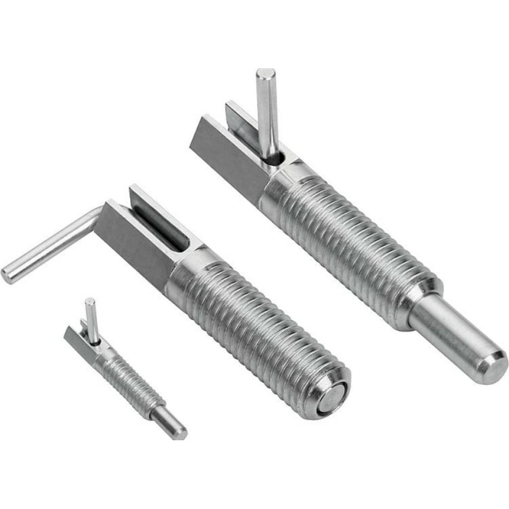 Материал:Сталь с синим пассивированием, коэффициент прочности 5.8.Указание:Штифты упорные применяются там, где необходимо предотвратить изменение положения фиксации, вызванное воздействием поперечного усилия. Переход в другое положение фиксации возможен только после ручного вывода болта из зацепления.