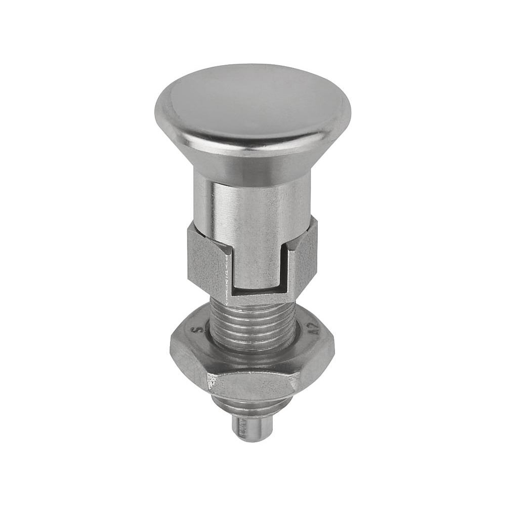 Материалы:Резьбовая втулка и грибковая ручка 1.4305.Стопорный штифт не закаленный из нержавеющей стали 1.4305 без покрытия.Прижимная пружина 1.4310.Указание:Упорные штифты применяются там, где должно быть предотвращено изменение положения поперечными силами.Переход в другое положение фиксации возможен только после ручного вывода болта из зацепления.