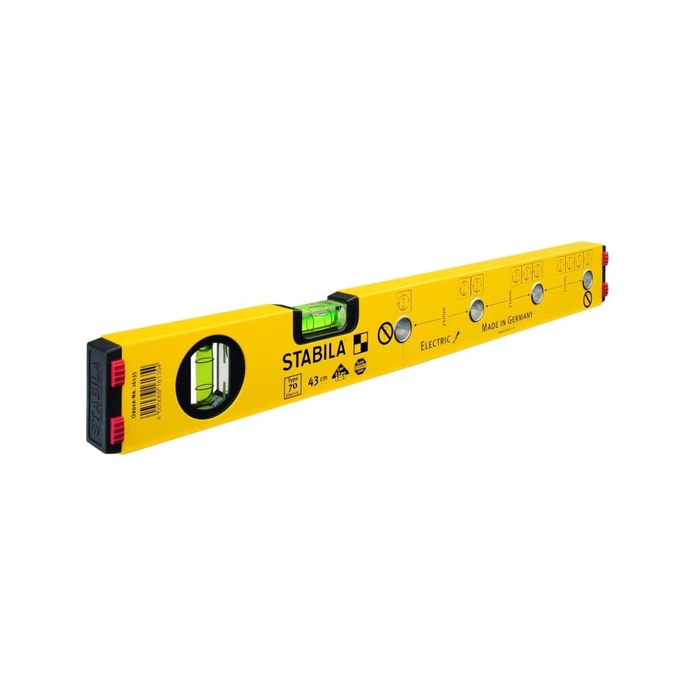 Уровень для электрика STABILA тип 70 Electric, 43 см 16135 - специализированный инструмент, используемый для работ в области электропроводки. Позволяет отметить вертикаль и горизонталь, расстояние между отверстиями для установки розеток и выключателей. Уровень имеет прямоугольный профиль, на концах колпачки с элементами для защиты от соскальзывания. Точность: 0.029°=0.5 мм/м.