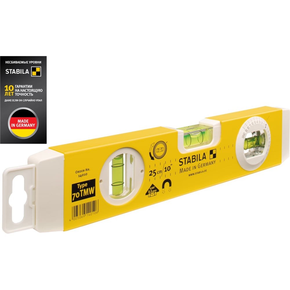 Магнитный уровень с угломером тип 70TМW STABILA 14010 укомплектован тремя ампулами. Магнитное основание облегчает крепление и проведение выверки на металлических конструкциях. Изделие применяется при строительных работах, когда необходимо измерить угол и наклон поверхностей. Длина инструмента всего 25 см, что способствует работе в стесненных условиях.