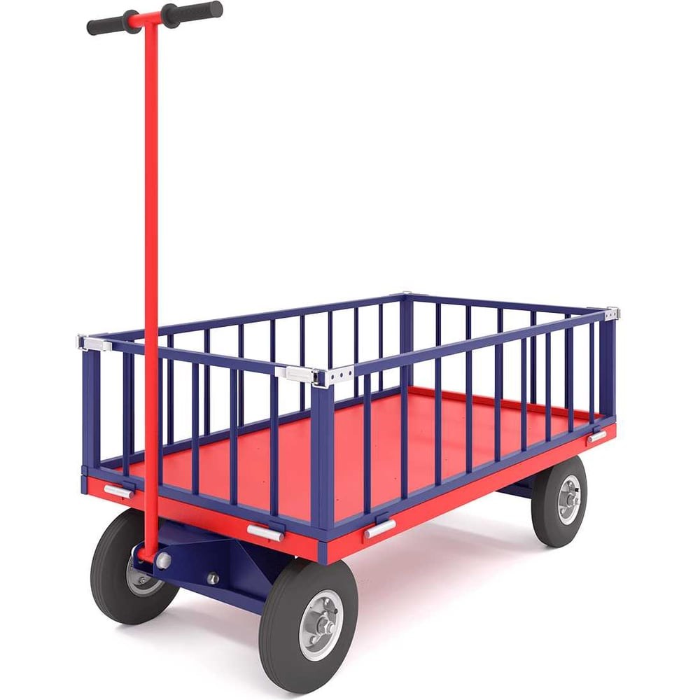 Платформенная усиленная тележка с поворотной осью RUSKLAD ТПОБ 5 Т, 700x1200x300 мм, с пневматическими колёсами ТПОБ 5 Т пневмо оснащена бортиками из металлических труб, которые предотвращают скатывание груза с платформы. Изделие способно выдерживать нагрузку до 450 кг. Прочная конструкция обладает четырьмя пневматическими колесами диаметром 250 мм. Тележка имеет поворотную ось для удобства разворачивания конструкции. Полимерное порошковое покрытие устойчиво к влиянию коррозии, что дает возможность использовать тележку на открытом воздухе даже при неблагоприятных погодных условиях. Специальные резиновые накладки на рукоятке обеспечивают надежный захват без эффекта проскальзывания рук. Благодаря системе навесом установка и съем бортов осуществляется максимально легко.