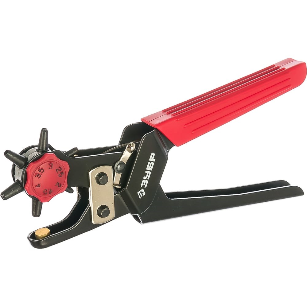 Револьверный дырокол для кожи, усиленный, 6-в-1, 2-4,5мм Зубр "МАСТЕР" 22945 также подойдет для резины, пластика и картона. Простой револьверный механизм позволяет быстро настроить нужный диаметр для пробивания отверстия. Инструмент выполнен из стали SAE1008.