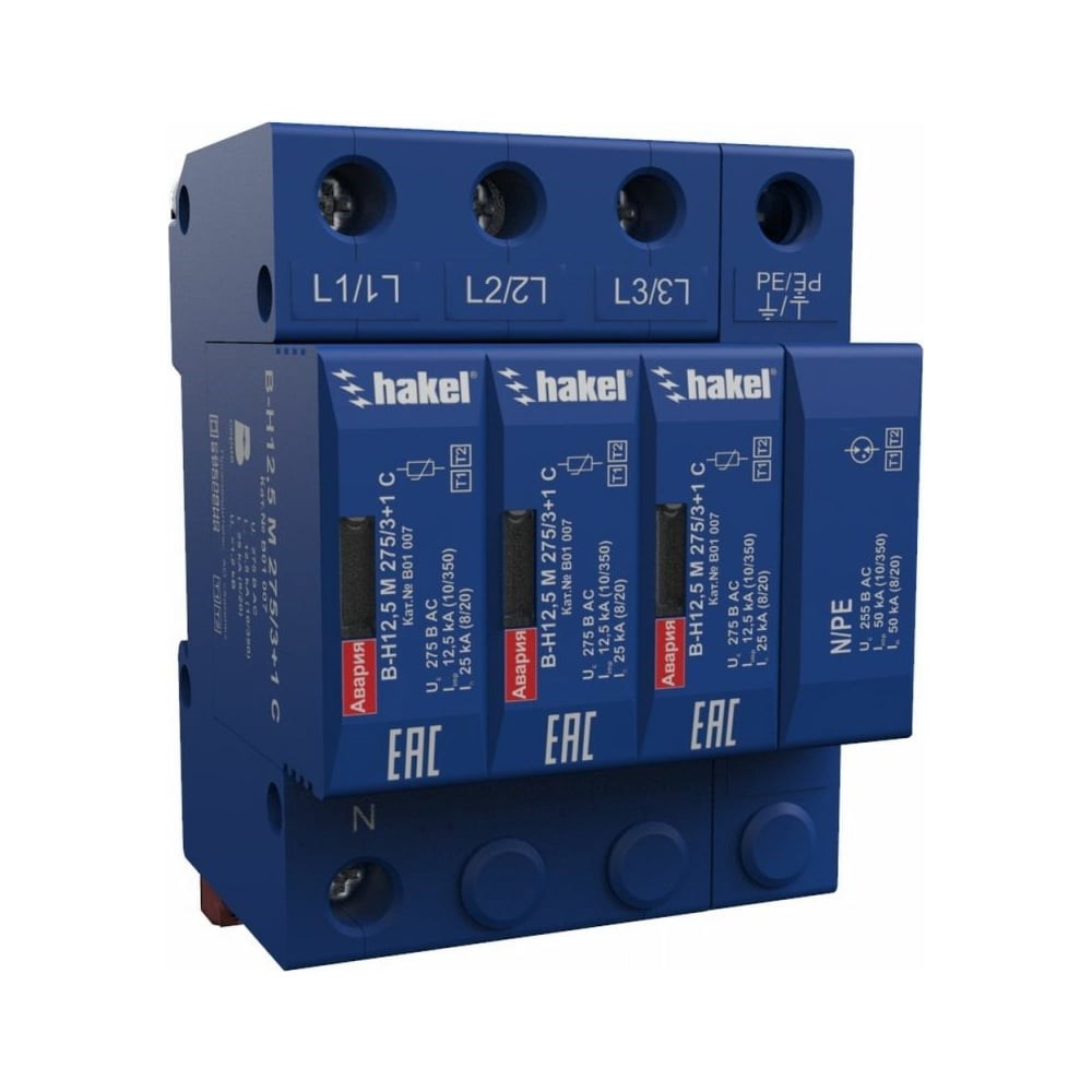 Устройство защиты от импульсных перенапряжений К2 Ключевой Компонент В-Н12.5 275/3+1 С В01007 применяется в низковольтных электрических сетях на границе 0А(В) - 1 зон молниезащиты (в соответствии с «Инструкцией по устройству молниезащиты зданий, сооружений и промышленных коммуникаций» СО 153-34.21.122-2003) при кабельном подземном или воздушном вводах электропитания в качестве I+II ступени защиты, в соответствии с: ГОСТ Р 50571-4-44-2011, ГОСТ Р 50571.5.53-2013, ГОСТ IEC 61643-11-2013. Предназначено для защиты фазных и нулевого проводников от противофазных (поперечных) перенапряжений в цепях L*/N, и синфазных (продольных) перенапряжений в цепи N/PE в системах переменного тока. Выпускается на максимальное длительное рабочее напряжение Uc= 275 В AC. Способно отводить импульсы тока Iimp(L/N)(10/350) = 12.5 кА, Iimp(N/PE)(10/350) = 50 кА. УЗИП со сменными модулями поставляется в комплекте с допконтактами.