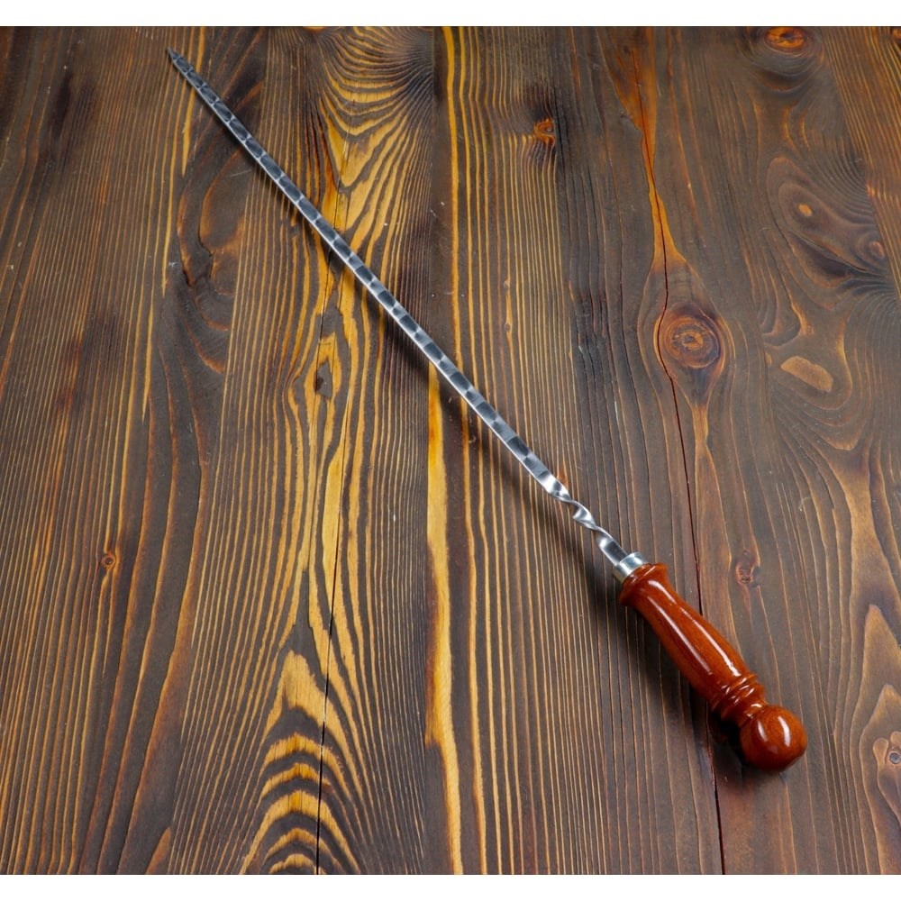 Узбекский шампур для шашлыка с деревянной ручкой и узором СИМАЛЕНД 50 см 3815913 - необходимый инвентарь для приготовления классического и любимого угощение во время отдыха на природе. Благодаря деревянной ручке минимизируется вероятность ожога, а также шампур удобно держать. Витая часть шампура позволит ему держаться в нужном положении, что также позволит правильно переворачивать и равномерно прожарить продукт.