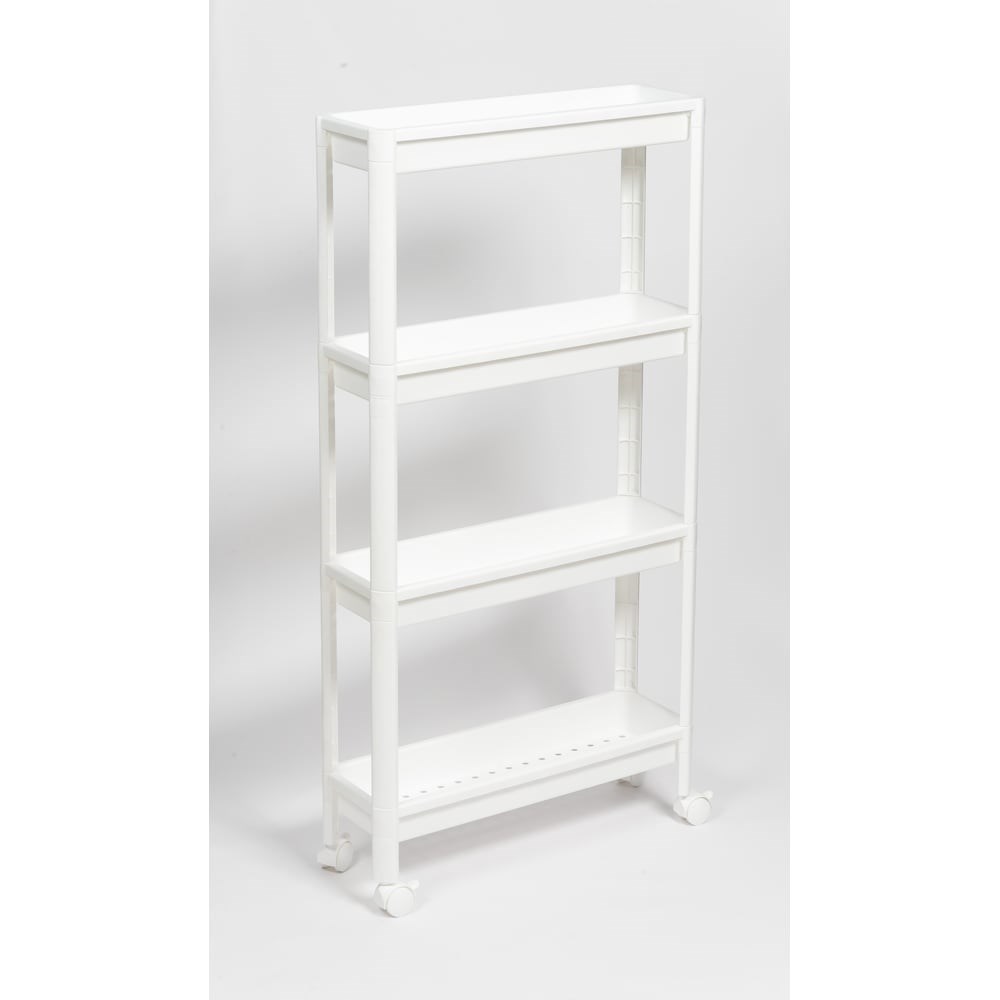 Этажерка Violet VIKEA узкая, 4-х ярусная, на колесах, белая 782406 – идеальное решение для организации пространства на кухне и в ванной, в гостиной и на балконе, а также в любом другом помещении. Прекрасно впишется в пространство любой комнаты. Состоит из нескольких ярусов. Имеет оптимальное расстояние между полками. Это позволяет разместить все самые необходимые полезные в хозяйстве мелочи. Стойки надежно соединяются внутренним замком, что обеспечивает монолитность конструкции и дает возможность поднять и переместить этажерку за верхнюю полку. Каркас этажерки выполнен из прочного пластика и не прихотлив в уходе. Достаточно протереть влажной тряпкой или промыть под струей теплой воды. Узкий стеллаж оснащен четырьмя небольшими колесами с фиксаторами для свободного перемещения, благодаря которым этажерка становится мобильной и многофункциональной. Изделие безопасно, не имеет острых углов и изготовлено из экологичного материала, не содержащего бисфенол А и предназначенного для контакта с пищевыми продуктами. Изделие поставляется в разобранном виде в индивидуальной коробке.