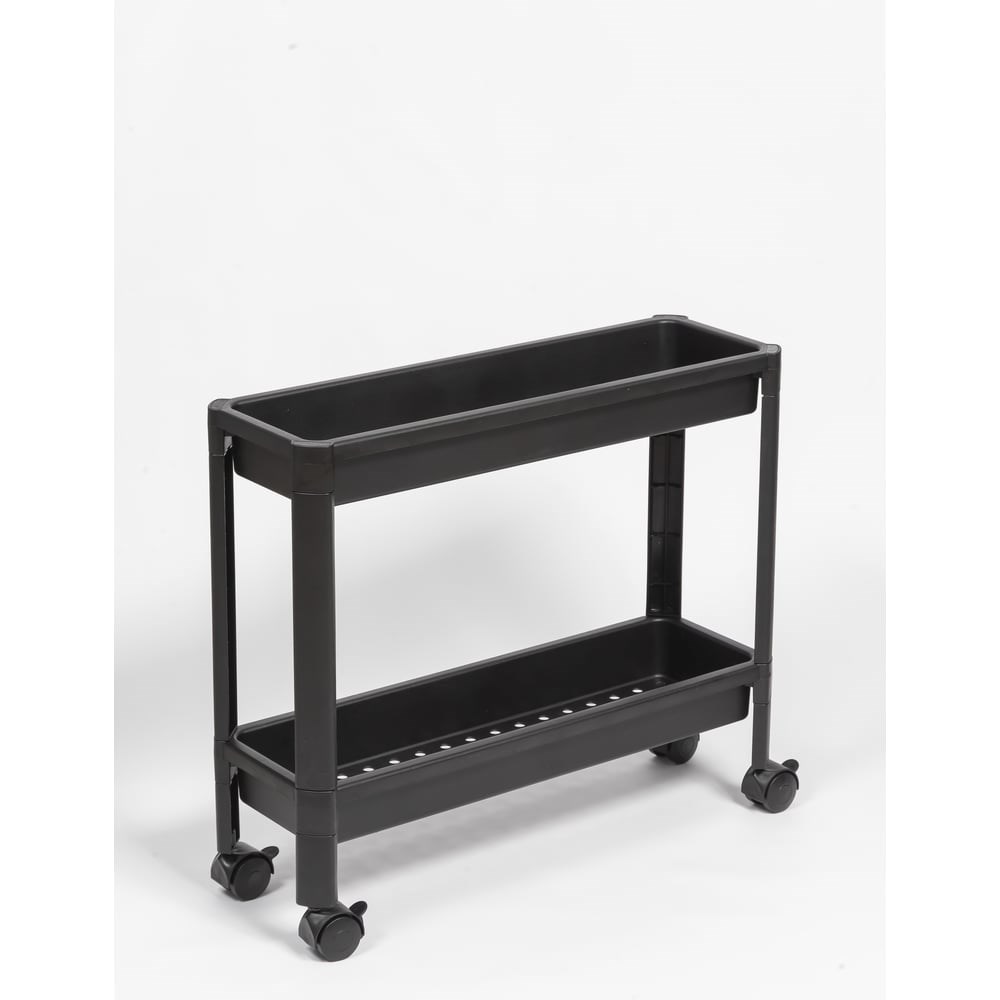 Этажерка Violet VIKEA узкая, 2-х ярусная, на колесах, черная 782207 – идеальное решение для организации пространства на кухне и в ванной, в гостиной и на балконе, а также в любом другом помещении. Прекрасно впишется в пространство любой комнаты. Состоит из нескольких ярусов. Имеет оптимальное расстояние между полками. Это позволяет разместить все самые необходимые полезные в хозяйстве мелочи. Стойки надежно соединяются внутренним замком, что обеспечивает монолитность конструкции и дает возможность поднять и переместить этажерку за верхнюю полку. Каркас этажерки выполнен из прочного пластика и не прихотлив в уходе. Достаточно протереть влажной тряпкой или промыть под струей теплой воды. Узкий стеллаж оснащен четырьмя небольшими колесами с фиксаторами для свободного перемещения, благодаря которым этажерка становится мобильной и многофункциональной. Изделие безопасно, не имеет острых углов и изготовлено из экологичного материала, не содержащего бисфенол А и предназначенного для контакта с пищевыми продуктами. Изделие поставляется в разобранном виде в индивидуальной коробке.
