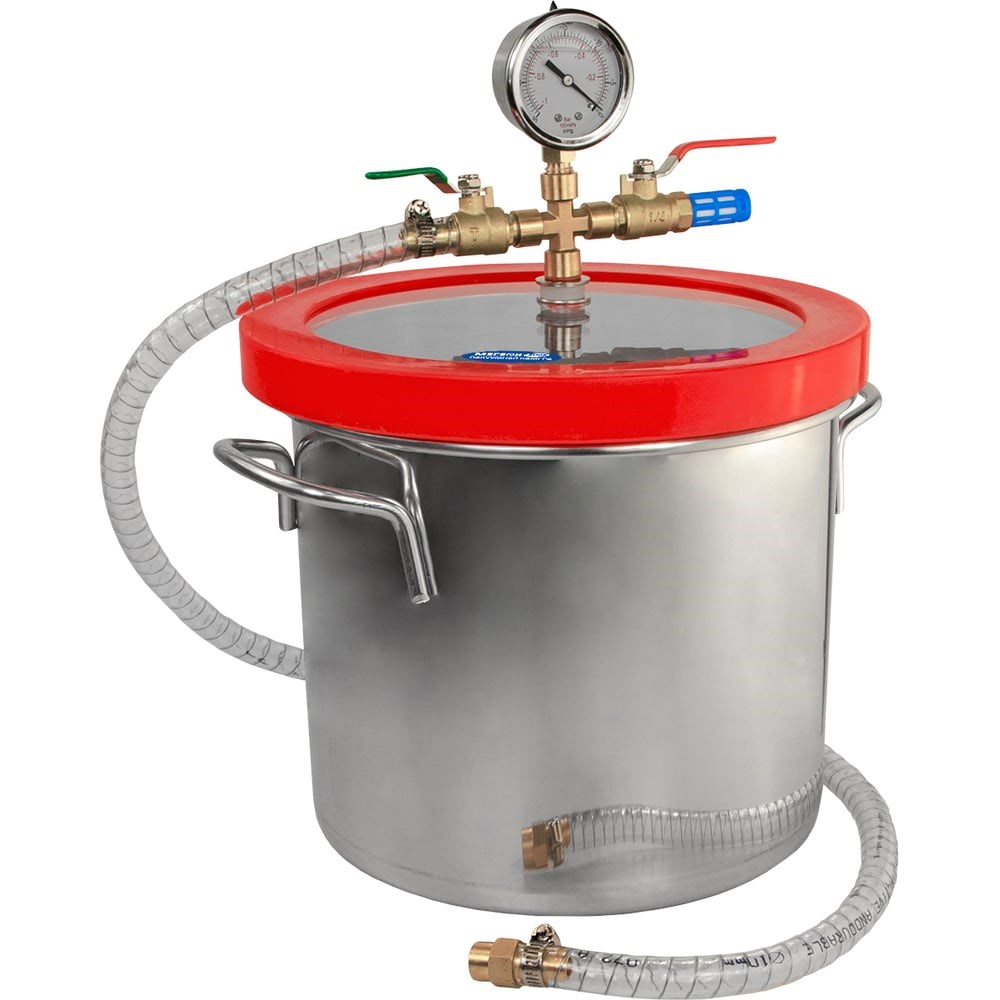 МЕГЕОН 51709 – многоцелевая вакуумная камера объёмом 20 литров, предназначенная для пропитки, стабилизации, окраски, осушения, дегазации, проведения исследований в вакууме и других применений. Ёмкость изготовлена из нержавеющего сплава стенки которой, имеют оптимальную толщину для работы с нагрузкой до -100 кПа. В качестве материала крышки было применено прозрачное органическое стекло толщиной 19 мм. На крышку установлен коллектор с манометром, двумя кранами, фильтром и двухстороннее силиконовое уплотнение. Всасывающий шланг имеет специальную армировку с целью исключить деформацию при нагнетании разряжения. Изделие идеально подойдет для работы совместно с вакуумирующими насосами моделей МЕГЕОН 98031, 98033 и 98036. Оборудование имеет простую и надёжную конструкцию, которую по достоинству смогут оценить любители и профессионалы.