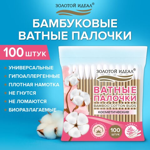 Ватные палочки КОМПЛЕКТ 100 шт., бамбуковый стик, 100% хлопок, зип-лок, ЗОЛОТОЙ ИДЕАЛ, 116556